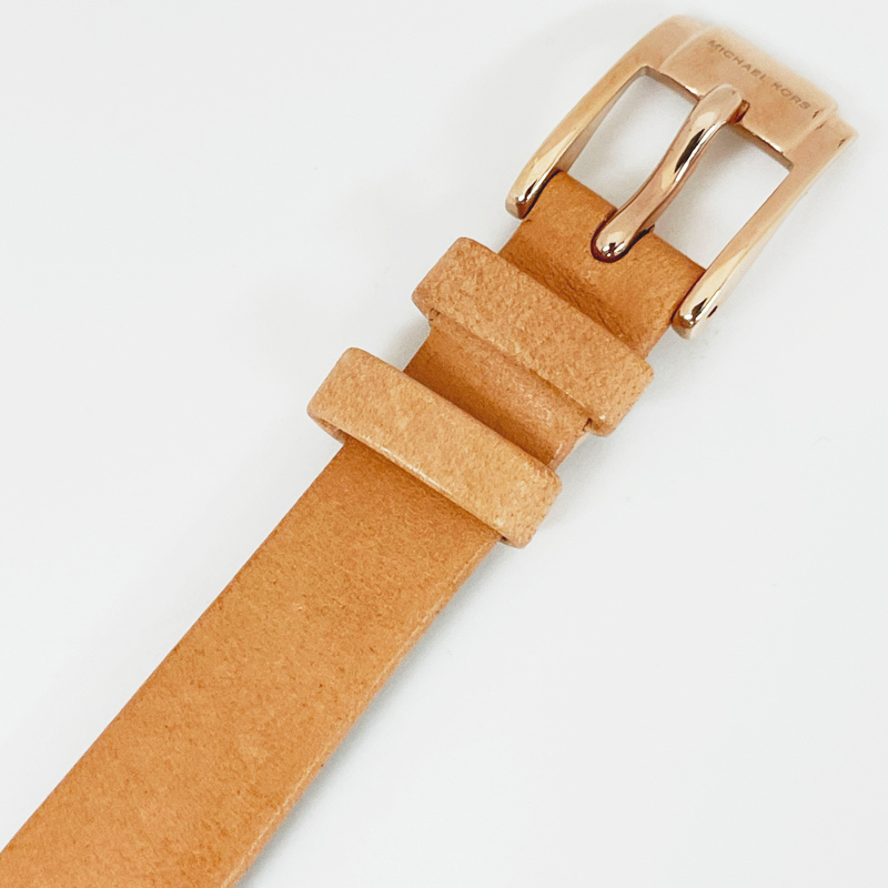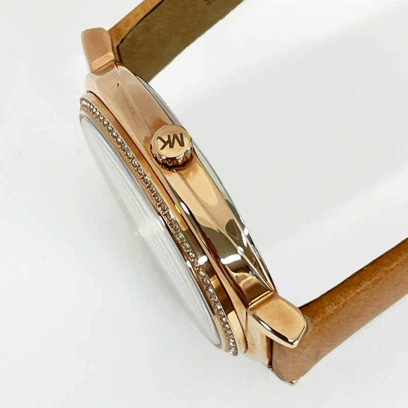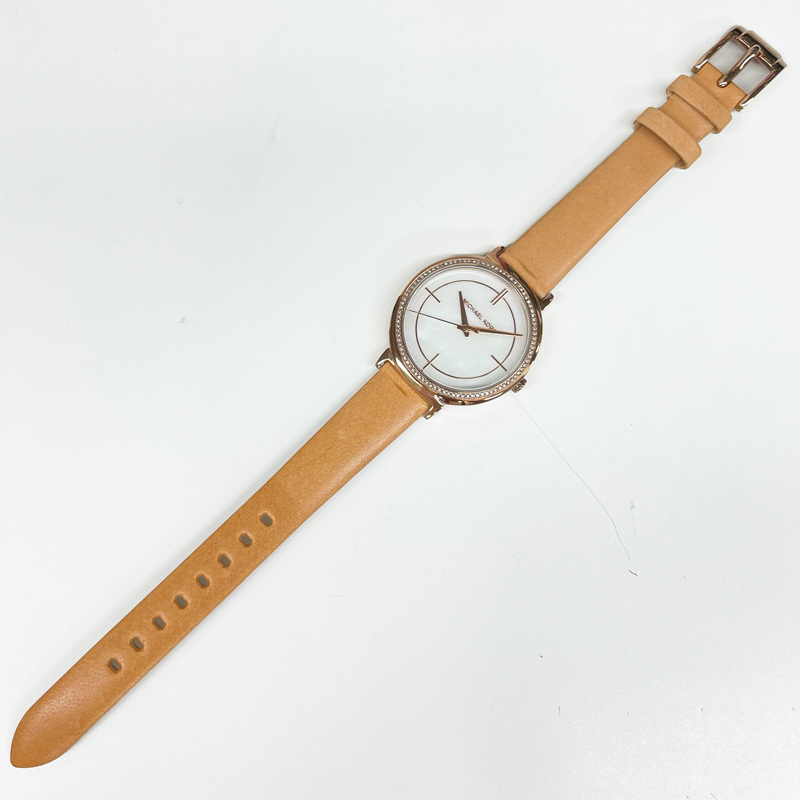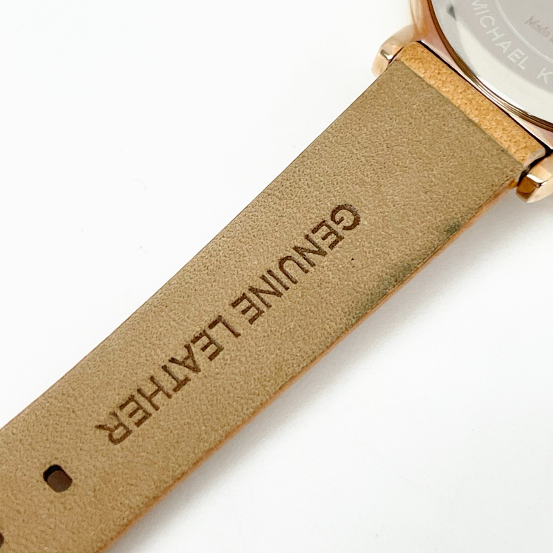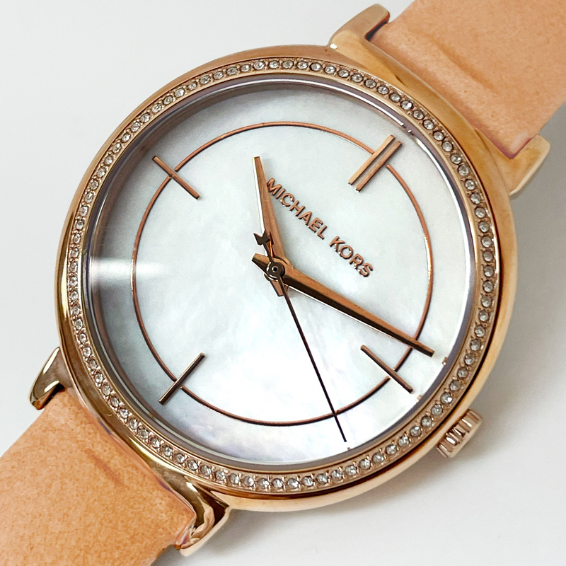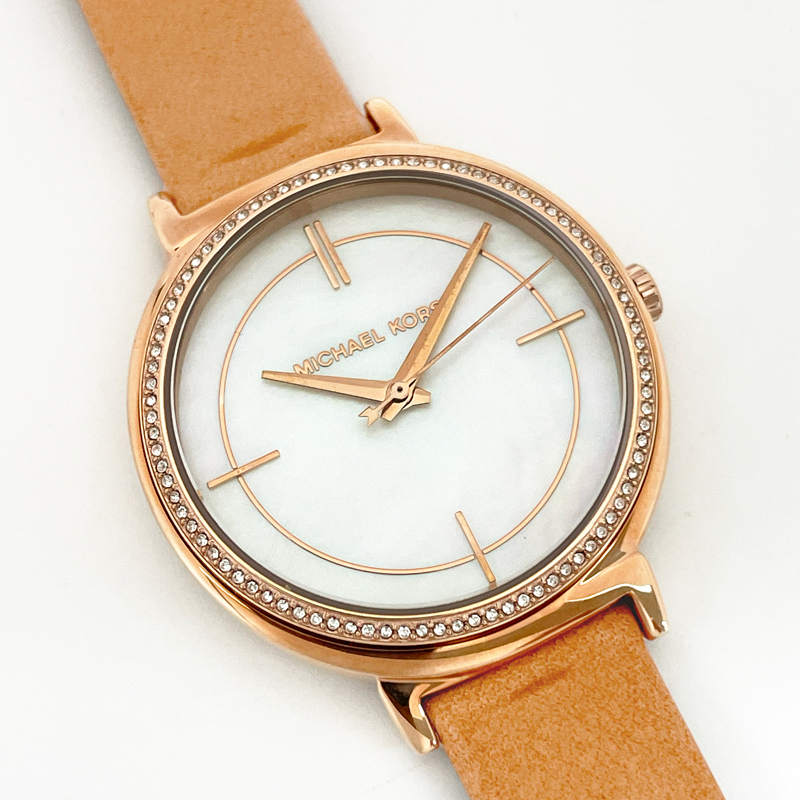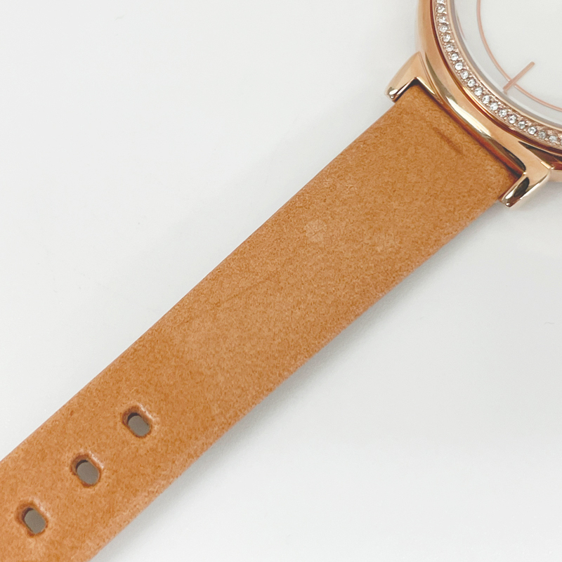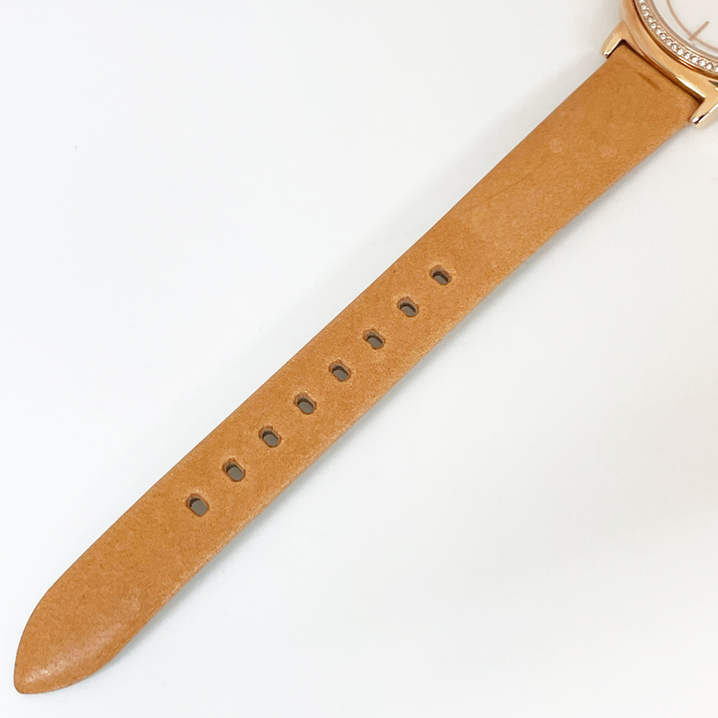 ・詳細はローズゴールドステンレスケース、ベージュブラウンレザーベルト、ミネラルガラス、マザーオブパール文字盤、クォーツ(電池)、5気圧防水です。