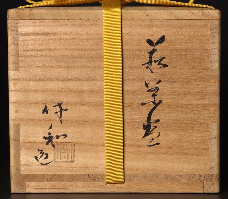 【十代三輪休和(休雪)】 明治28年-昭和56年(1895-1981)山口県生まれ。職種:陶芸家。萩焼陶家三輪家十代。出自:父は九代三輪雪堂明治43年(1910)、旧制中学を2年で中退し、陶工の道に入る。昭和2年(1927)、十代休雪襲名。昭和17年(1942)、半泥子に招かれ、三重県津市にて、荒川豊蔵、金重陶陽と会い、4人でからひね会を結成。昭和32年(1957)、無形文化財「萩焼」の関係技芸者に指名。昭和42年(1967)、72歳で弟節夫に代を譲り、隠居。休和を名乗る。昭和45年(1970)、国の重要無形文化財「萩焼」保持者認定。 【即中斎 表千家13世家元 無盡宗左(無尽宗左)】 12世敬翁宗左の二男であったが長男が早死であった為、1937年に家元を襲名。その後、42年に同門会(後75年に社団法人表千家同門会)を発足させ機関紙を発行するなど現代茶の湯の発展に尽力、70年には日本全国に支部を持つようになり、また海外においてもハワイ、ロスアンゼルス、サンフランシスコを拠点に普及活動を進める。 |