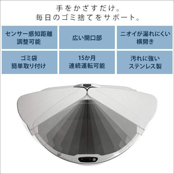 | 【ポイント】 手をかざすだけで蓋が開く自動開閉式ゴミ箱です。 蓋が横開きなのでニオイが漏れにくく、ステンレス製なのでお手入れ楽々です。 45リットルのゴミ袋まで対応しており大容量です。 単一電池2本で約4500回の開閉が可能で電池切れなどの緊急時は手動開閉も可能です。 |