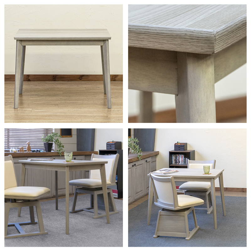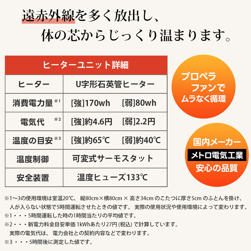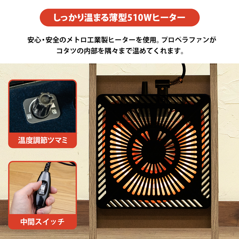 | 材質 | 天板:27mm厚合成樹脂化粧繊維板(メラミン化粧板)、 幕板、脚:ラバーウッド(PU塗装) 510W石英管ヒーター(3mコード、手元コントローラー) |