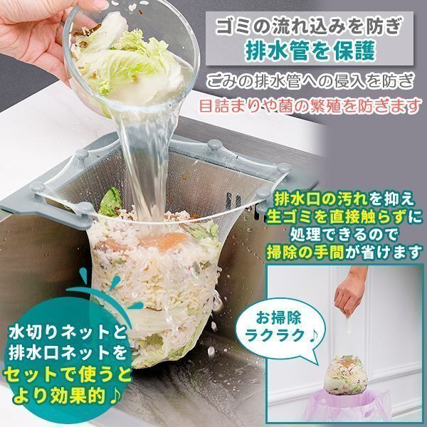 水切りネットと排水口ネットセット使うと、排水口の汚れを抑え、生ゴミを直接触らずに処理でき、髪の毛が目皿に絡むのを防ぎ、掃除の手間を省けます。