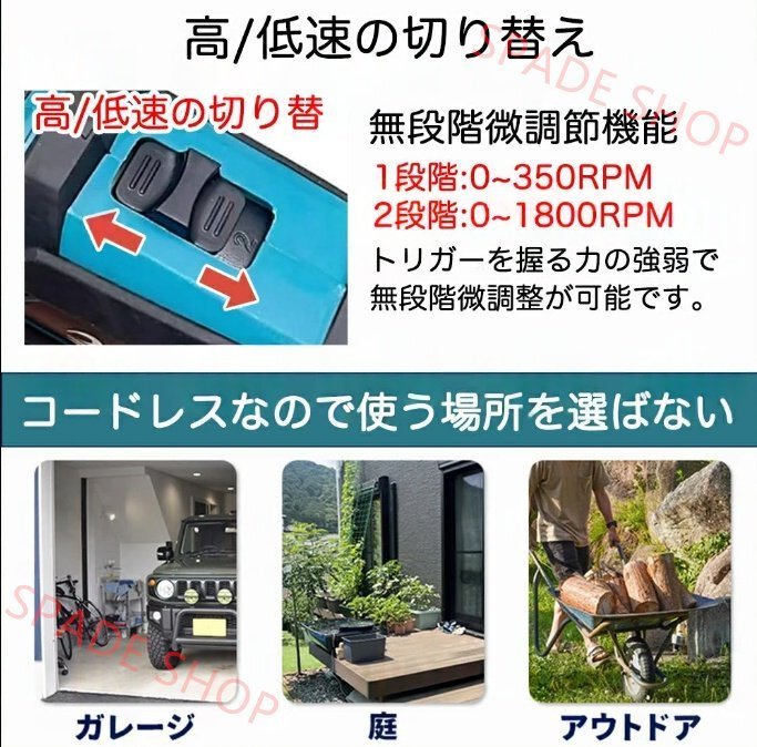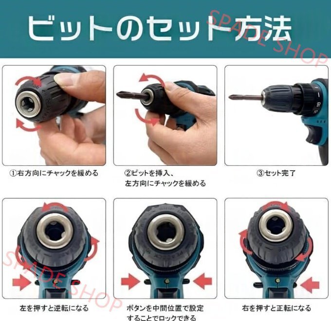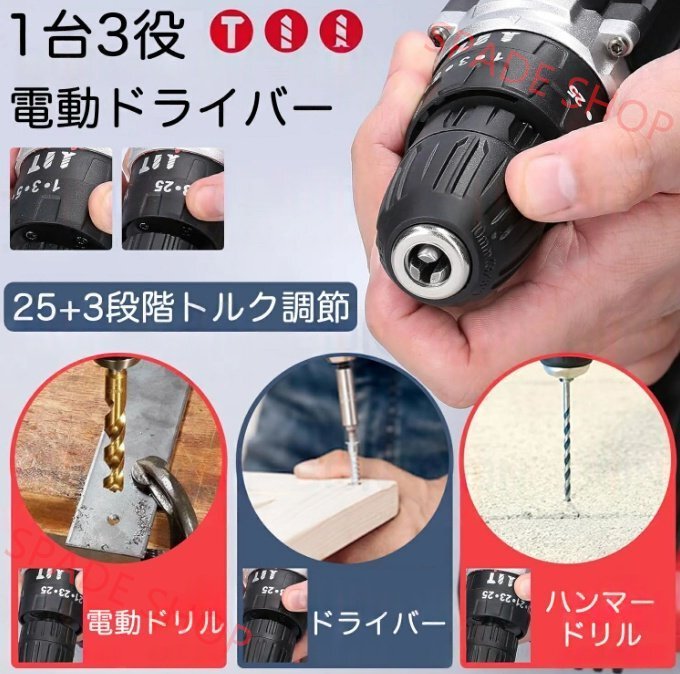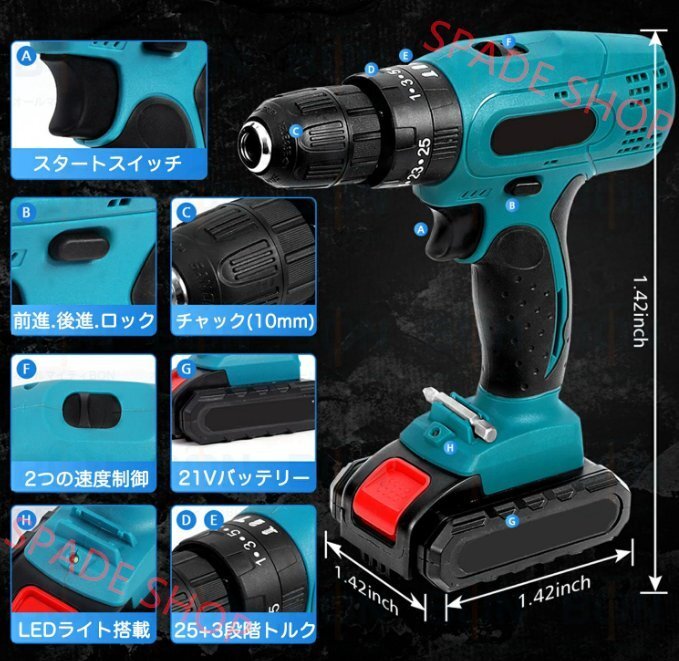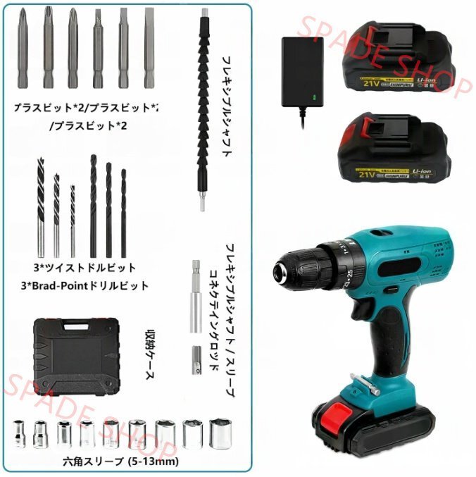 21V高性能電動ドライバーセット 家具の組み立てや、DIYの強い味方! 1台3役充電式電動ドリルとドライバーとして使用でき、家具の組立、木材の穴開け、ネジ締めなど様々な作業で活躍します。コードレス設計なので、電源がない場所でも手軽く使えます、女性でもDIY家具組み立てなどに楽にできます。 クラッチ機能、25段階にトルク調節可能。 スピード調節機能、回転スピードを2段階に切り替え可能。 正逆転ワンタッチ切り替え 高品質な収納ケース、収納が簡単で場所を取らない 高/低速の切り替 高速モード(0~1800rpm)と低速モード(0~350rpm)に切り替えられます。木材に穴を開けるときは低速回転にし、金属に穴を開けるときは高速回転にするもが魅力です。 軽量だから片手で持っても疲れにくい、女性でもDIY家具組み立てなどに楽にできます。 軽量電動ドリル 電動ドリルドライバーの本体重量は約1.2kgで、小型軽量、持ち運びやすいです。また、人間工学に基づいて、グリップ部に滑りにくいな素材を採用され、グリップも握りやすい太さに設計しております。 正逆回転切替スイッチ 正逆転切り替えレバーを左/右へ調整し、ビットの回転方向が切り替え、ネジを締める/緩めることができます。中間に置くとロックになり、不意な始動を避けます。 LED照明ライト付き 電源スイッチの側にLEDライトがついている電動ドリルドライバーです。作業の同時にライトが点灯しはっきり手元を照らして、暗くて見づらい場所でも簡単に作業できます。 |