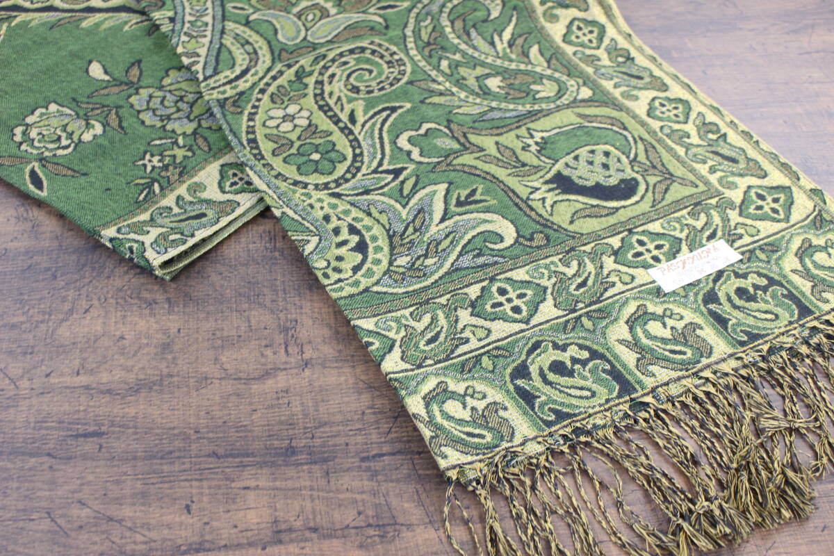 新品【パシュミナ Pashmina100%】金糸混 ペイズリー花柄 ピスタチオカラー 緑 ゴールド 金 GOLD 大判 ストール