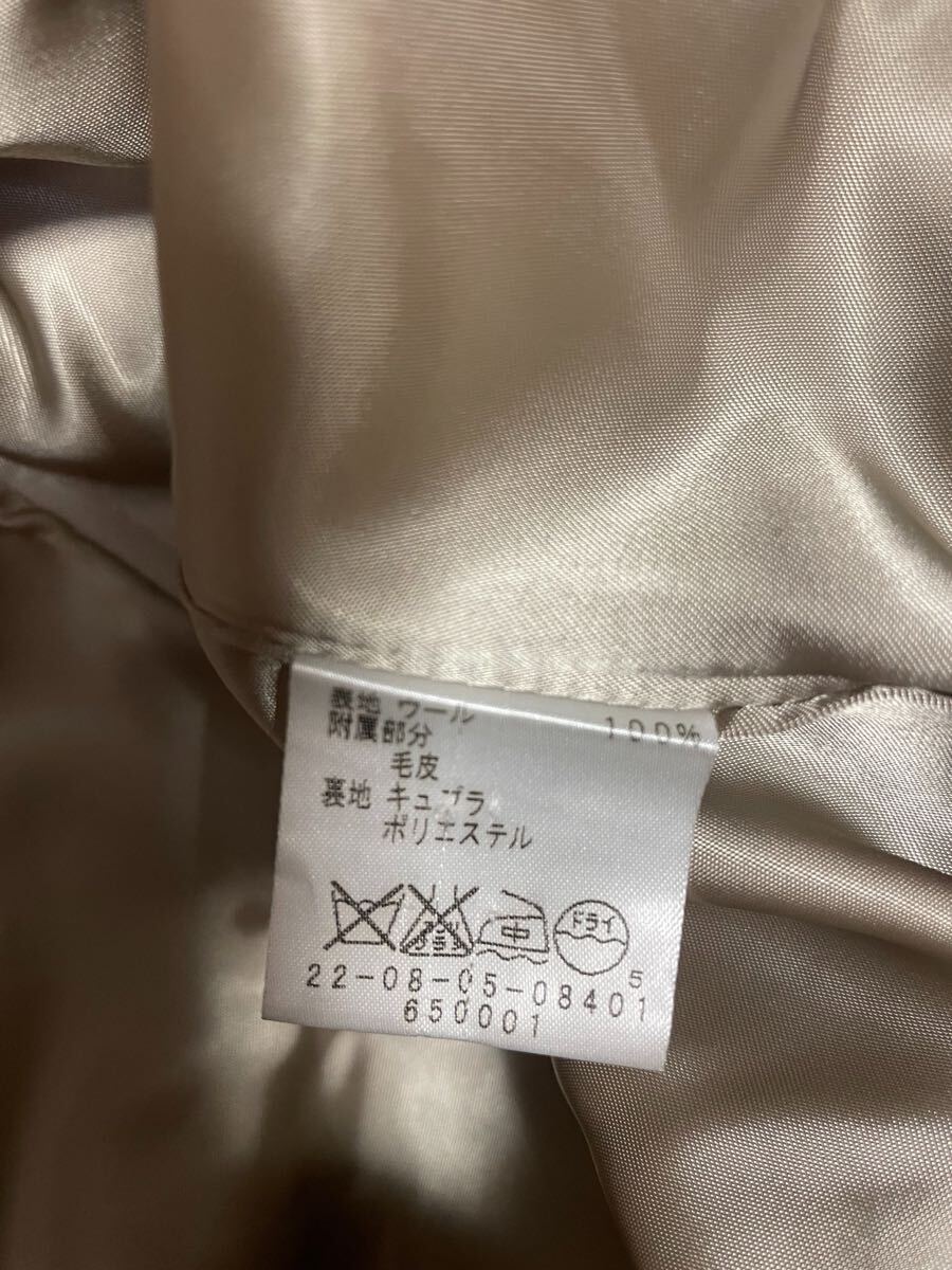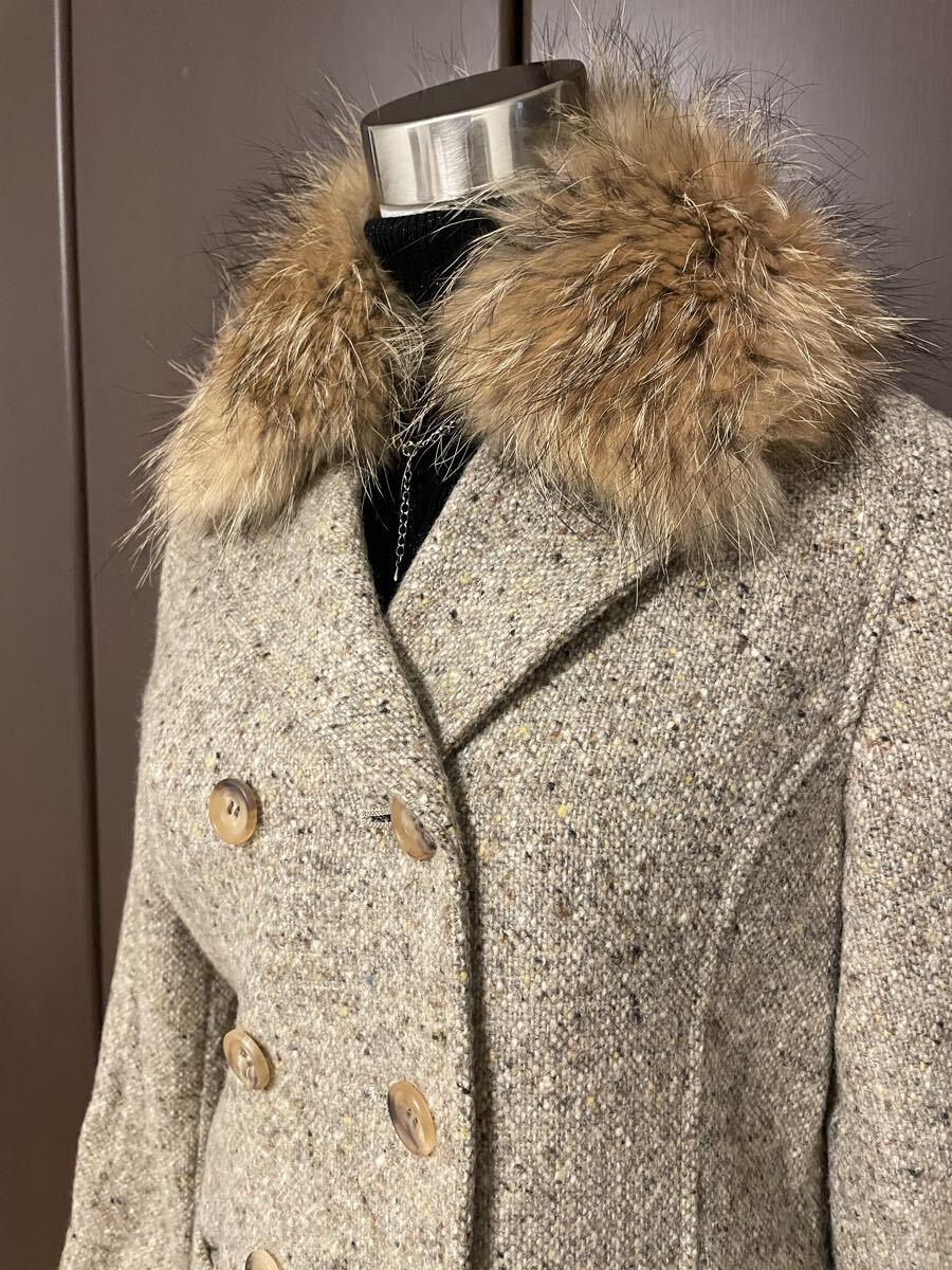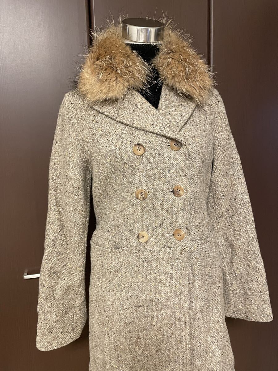 デプレ DES PRES のウールコートです。ツイード、ベージュ系色。ハーフ丈。素材は、ウール100%、裏地キュプラ・ポリエステル。ファーのティペット付き。サイズ表記なし、9号くらい。身幅約47〜60㎝、丈約90㎝。前ボタンダブル3つ。両サイドポケットあり。数回着用してます。気になる方はご遠慮ください。※商品以外のアクセサリー・トップス・パンツは含まれません。