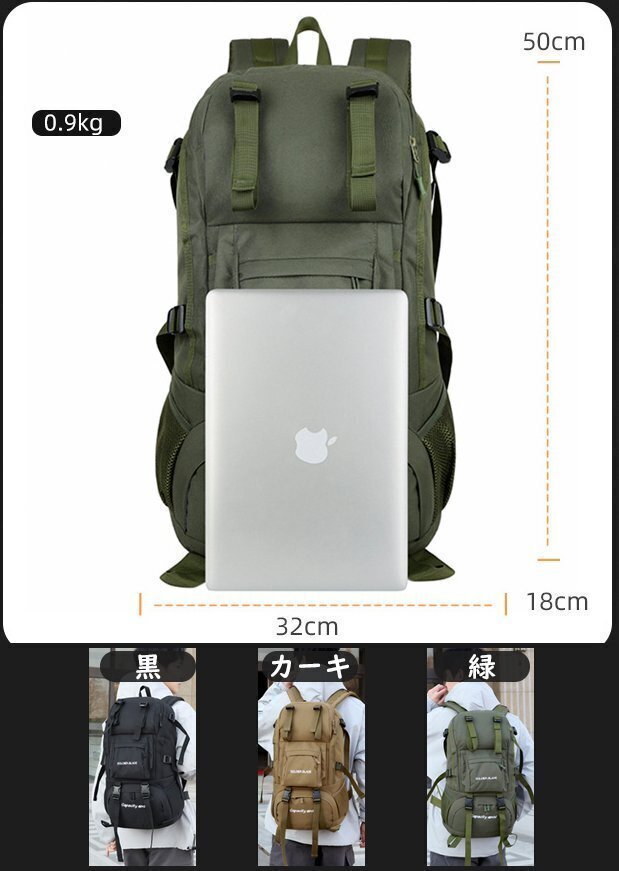 【商品状態】未使用【素材】ナイロン、ポリエステル【カラー】グリーン【サイズ】 約32* 50*18cm【容量】55L通気性、防水性、抗菌性アウトドアに最適な55L防撥水登山リュックです。背中に当たる部分は通気性に優れたメッシュ・クッションの構造です。防撥水600Dオックスフォー