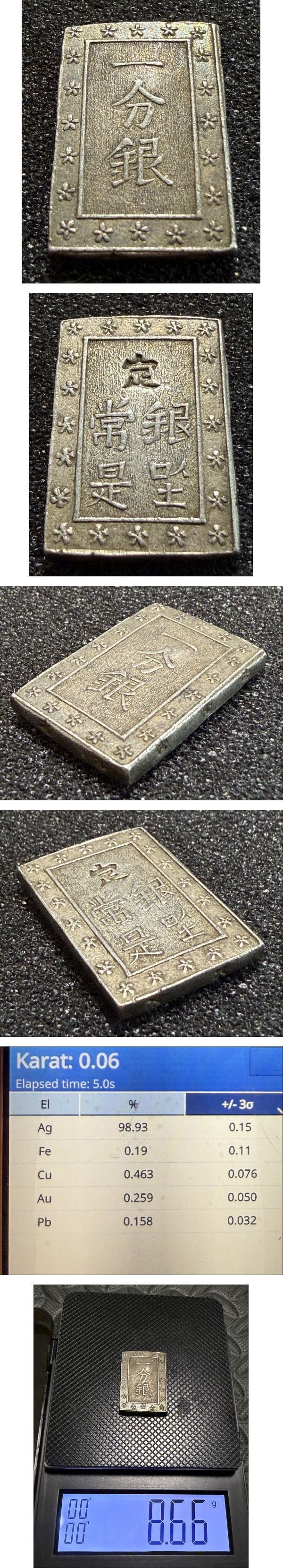 | 商品説明 | 【商品内容】 かなり希少【本座 天保一分銀 Pn ほぼ両面額縁様 】 著書「禁断の劣位」の中で、【Pn】は【位付4】 著書「一分銀収集の手引き」では【位付7】 になり、かなり希少な品物です。 表P型で【Pn】は希少性【1位】です。 プラス【ほぼ両面額縁様】です。 両面額縁様は、私の感覚だと100枚中1~2枚程度しかないのかなぁと感じます。 【品位】 銀98.93% 金0.259% OLYMPUS VANTA 蛍光X線分析計機 (約400万円)で測定。 鑑定結果は写真に掲載しています。 【量目】:8.66g 【状態】: 銀座オークションにて落札した一分銀です。 【本座 天保一分銀 Pn ほぼ両面額縁様 】となります。 コンディションは写真でご判断ください。 現状で気に入っていただける方のみお願い致します。 計量器は安価な物ですので多少の誤差はあると思います。 発送は【おてがる配送ゆうパケットポスト】を選んでいただき コインホルダーに入れ、プチプチに包み さらにプチプチ付き封筒に入れて発送いたします。 ◆あくまで個人保管品です。 画像にてご判断いただき、ご納得いただける方のみご入札をお願い致します。 また画像には限りがございますので、色味が異なる場合などあるかもしれません。 詳細部分にこだわる方、完璧をお求めになる方、状態に神経質な方もご遠慮願います。 商品状態に関しては個人差がございます。 落札後の商品状態による返品や故障時の補償は一切お断りいたします。 (すり替え防止の為) ◆不要なトラブルを避けるため、3日以内のご決済、 速やかな受け取り連絡をお守り頂ける方のみとしております。 あらかじめご了承ください。 お守り頂けなかった場合、落札者都合キャンセルとさせていただきます。 以上、全てをご了解いただける方のみご入札をお願い致します。 ■新規の方及び、評価が低い方の入札は取り消させていただく場合がございます。 ■領収証の発行は対応しておりません。 |