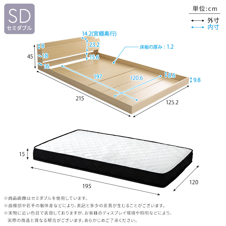 商品サイズ ベッドSD:(約)幅125.2×奥行215×高さ45cm