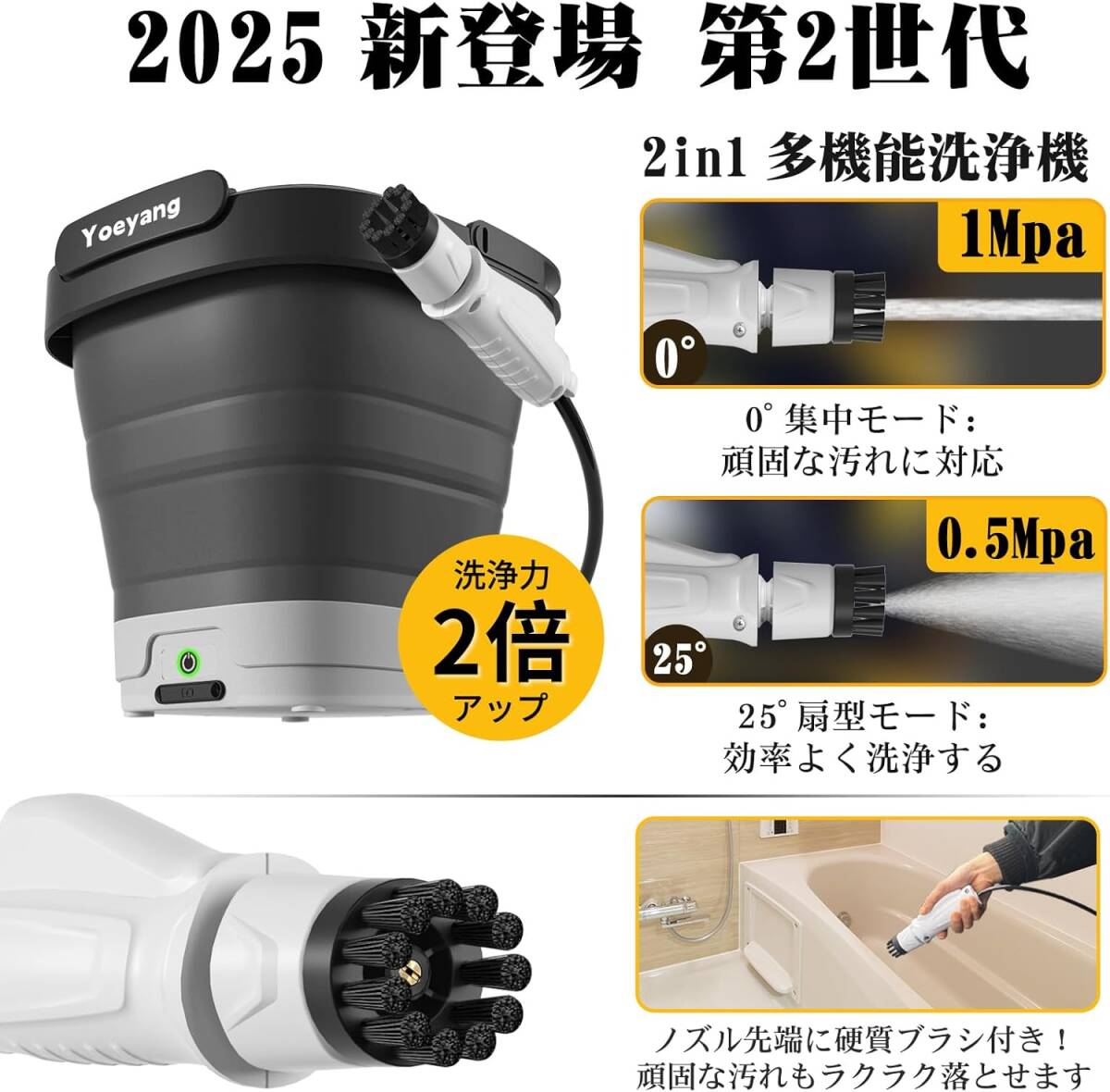【第二世代圧力強化・水道水の4倍の圧力】Yoeyangのコードレス高圧洗浄機は、第二世代に進化し、圧力が30%向上しました。最大圧力1MPa、流量2L/minを実現し、普通の水道水圧の4倍のパワーで、汚れや泥をしっかり除去します。付属の0°高圧ノズルと25°広角ノズルは、さまざまな清掃ニーズに応じて自由に切り替え可能です。さらに、付属のブラシは高圧洗浄機と併用することで、洗浄しながら同時にブラシで擦り、頑固な汚れを効果的に取り除くことができます。※内蔵バッテリー搭載のため、高圧洗浄機を水中に浸けないでください。