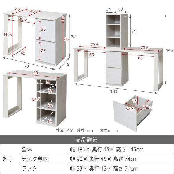 | 【カラー】 ナチュラル、ホワイト 【サイズ】 <外寸> 全体:幅180×奥行45×高さ145cm デスク単体:幅90×奥行45×高さ74cm ラック:幅33×奥行42×高さ71cm <内寸> ラックオープン部:幅29×奥行40×高さ64.5cm 引き出し上段:幅24.5×奥行38.5×高さ15(有効26)cm 引き出し下段:幅24.5×奥行38.5×高さ15(有効27)cm デスク面:幅73.5×奥行45×高さ74cm デスク下空間:幅65×奥行45×高さ69.5cm フック:出幅4×高さ65cm 可動棚:幅29×奥行39×厚み1.8cm(3.2cmピッチ11穴) 【材質】 本体:プリント紙化粧合板 天板:合成樹脂化粧合板(PVC) 引き出し前板:合成樹脂化粧パーティクルボード(PVC) 【耐荷重】 デスク面:30kg以下 可動棚:8kg以下 引き出し:7kg以下 【生産国】 中国 【梱包】2梱包でお届けします。 2-1 サイズ:96×49×13cm、重量:19.3kg 2-2 サイズ:95.5×47×15cm、重量:24.9kg 【その他】 ・可動棚:2枚 ・フック:4個 ・背面化粧有り 【組み立て品】 お客様による組み立てが必要です。 【ご注意】 ・サイズ、重量は概算です。 ・商品カラーはご使用のモニターによって実際の明るさや色と異なって見える場合がございます。 |