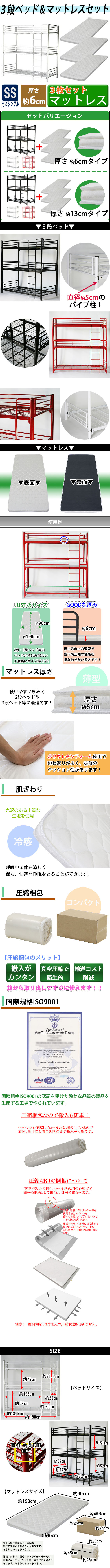 | 商品サイズ | 【本体外寸】 【3段ベッド】W約100x D約201x H約202(cm) 【マットレス】W約90×D約190×H約6(cm) 【梱包サイズ】 【3段ベッド】W約99.5×D約195×H約10(cm)/約25kg 【3段ベッド】W約101.5×D約195×H約11(cm)/約34kg 【マットレス】約W26x約D26x約H48.5(cm)/約4.3kg 【マットレス】約W26x約D26x約H48.5(cm)/約4.3kg 【マットレス】約W26x約D26x約H48.5(cm)/約4.3kg |