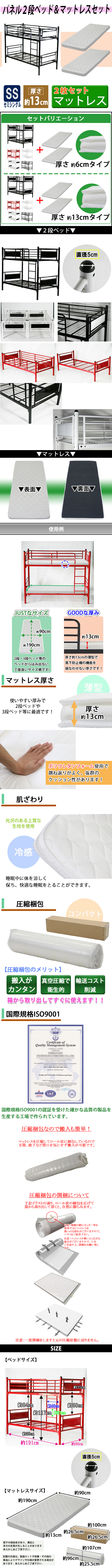 | 商品サイズ | 【本体外寸】 【2段ベッド】W約100x D約202x H約163(cm) 【マットレス】W約90×D約190×H約13(cm) 【梱包サイズ】 【2段ベッド】W約101×D約198×H約13(cm)/約52kg 【マットレス】W約26.5×D約26.5×H約100(cm)/約7.4kg 【マットレス】W約26.5×D約26.5×H約100(cm)/約7.4kg |