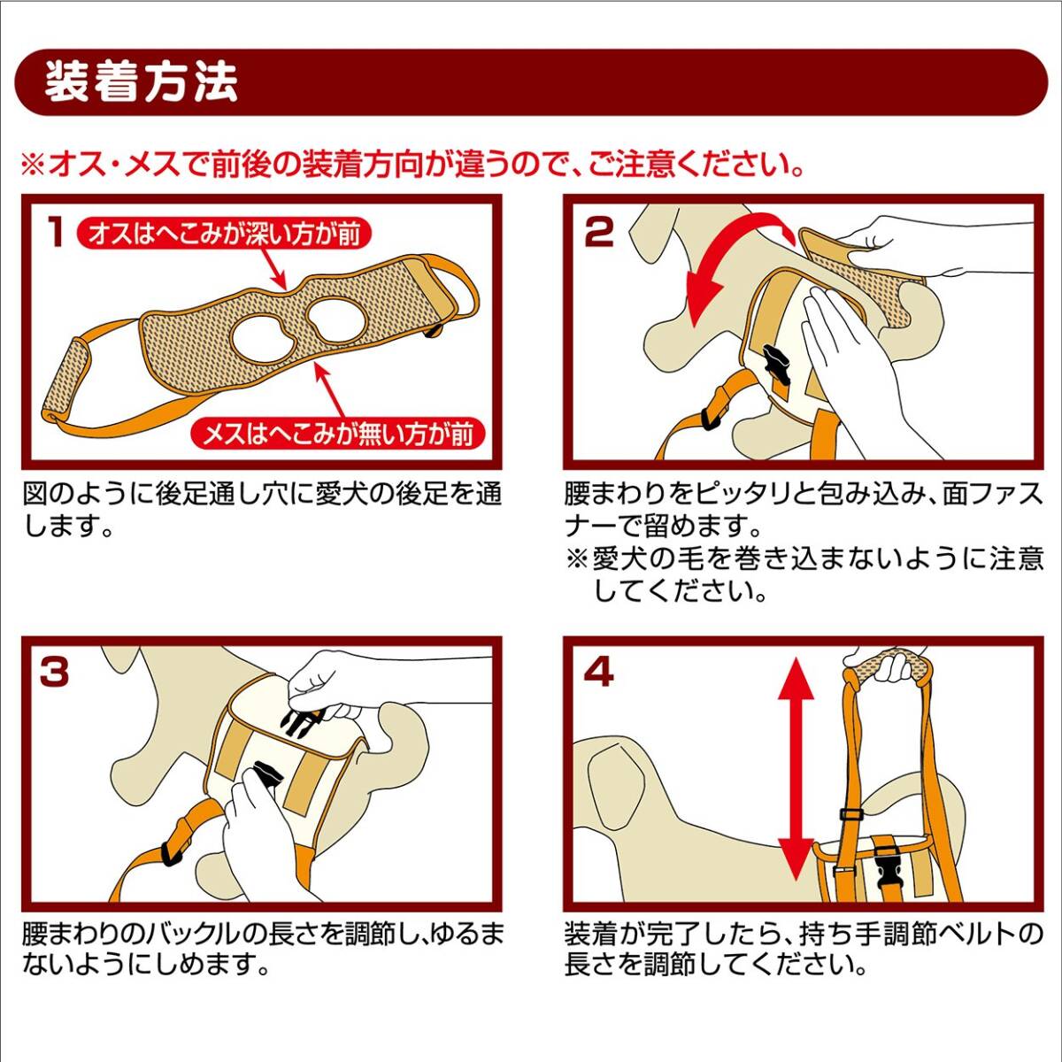 商品紹介 足腰の筋力が低下したときの歩行補助に。装着したままでもオス・メス共に排せつ可能。面ファスナーとワンタッチバックルで着脱簡単。手にやさしい持ち手クッションカバー付。負担のかかりにくい軽量素材。抗菌・アンモニア消臭の通気性メッシュ素材使用(内側) 使用上の注意 ●洗濯により色落ちする場合がありますので、他のものと一緒にしないでください。●洗濯機や乾燥機は使用しないでください。●汚れ等が気になる場合は、中性洗剤で軽く手洗いしてください。●漂白剤・ベンジン・シンナー・アルコール等は絶対に使用しないでください。●洗濯後はすぐに形を整えて陰干しし、完全に乾燥させてください。●火気や水気のそば・直射日光・高温多湿の場所をさけて保管してください。●幼児・子供・ペットのふれない所に保管してください。 原材料・成分 表地:ポリエステル100%、裏地:ポリエステル100%、パイピング:綿100%、テープ:ポリプロピレン 使用方法 <装着方法>※オス、メスで前後の装着方向が違うので、ご注意ください。1、(オスはへこみが深い方が前、メスはへこみが無い方が前)後足通し穴にワンちゃんの後足を通します。2、腰まわりをピッタリと包み込み、面ファスナーで留めます。※ワンちゃんの毛を巻き込まないように注意してください。3、腰まわりバックルの長さを調節し、ゆるまないようにしめます。4、装着が完了したら、持ち手調節ベルトの長さを調節してください。<正しい使い方>check1、ワンちゃんの背中の位置から真上に引き上げてください。Check2、ワンちゃんの横に立った状態で、地面とワンちゃんの背骨のラインとが必ず平行になる高さを保つように持ち手調節ベルトを調節してください。check3、ケガ防止のため、引きずらないように注意してください。※ワンちゃんの歩行速度に合わせて進み、無理に引き過ぎないように注意してください。 ~●本品は犬の歩行補助(後足)専用です。他の用途には使用しないでください。●事故防止のため、適応サイズ・適応体重以外の犬には使用しないでください。●使用前に破損箇所がないかを必ず確認してください。傷みが目立ち始めたら新しい製品に買い替えてください。●犬の健康状態を確認のうえ、使用してください。●万一、異常が見られた場合は直ちに使用を中止し、獣医師に相談してください。●胴まわり調節ベルト部分は指が2~~3本入る程度に装着し、しまり過ぎていないか、たえず点検してください。●犬が嫌がる場合は、無理に使用しないでください。●幼児・子供には使用させないでください。●火気や水気のそばでの使用や保管はしないでください。●幼児・子供・ペットのふれない所に保管してください。~