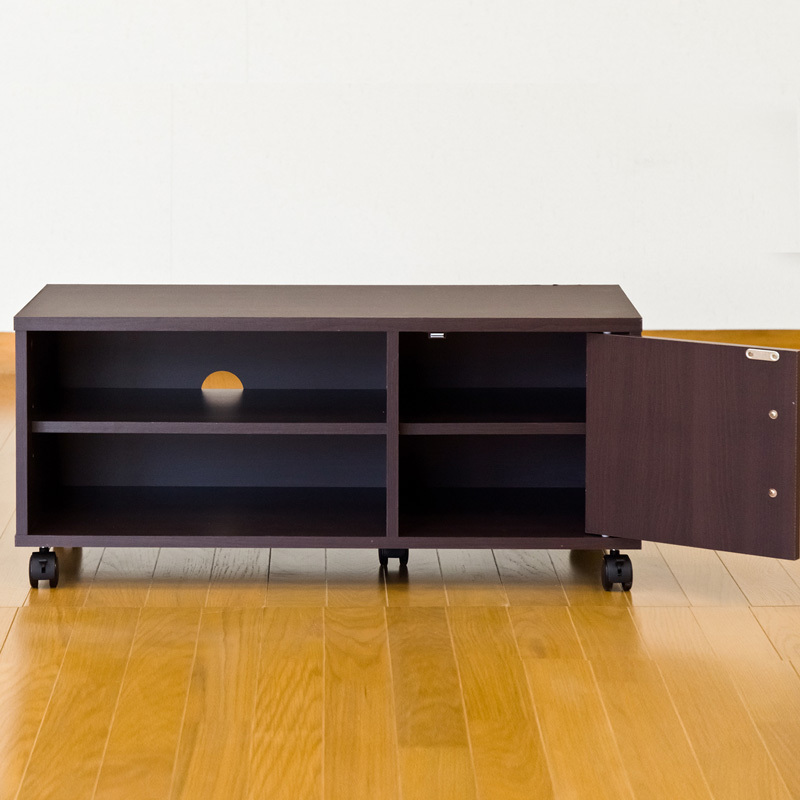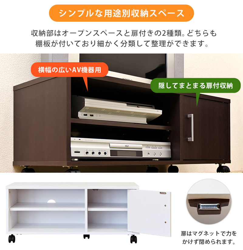 | 商品説明 | 組立品(約35分) お手頃価格のテレビ台! キャスター付きで移動も楽々! シンプルなデザインの扉付きテレビ台。 32インチ対応、キャスター付きなので移動や模様替えにも便利です。 オープン棚、扉付き収納棚のどちらも3cmピッチ3段階で高さ調節可能です。 キャスター4個のうち、前面の2個はストッパー付きで移動も固定も簡単ですね。 |