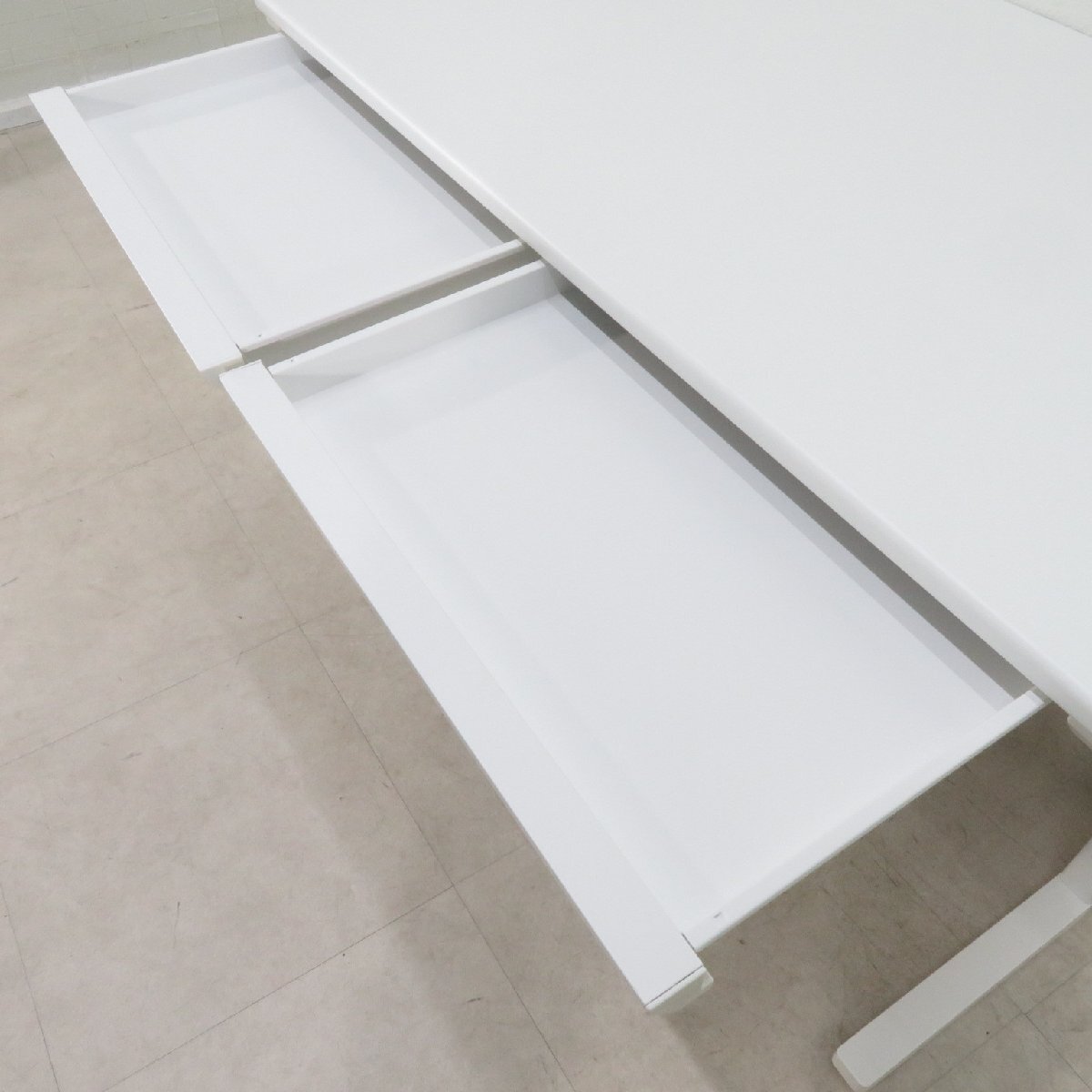 | 材 質 | 本体/天板/パーティクルボード(27mm厚)メラミン化粧繊維板(パーティクルボード)、幕板/スチール粉体塗装(ホワイト)、引き出し:金属(鋼)、表面加工:エポキシ樹脂粉体塗装 脚/脚フレーム/スチール粉体塗装(ホワイト) |