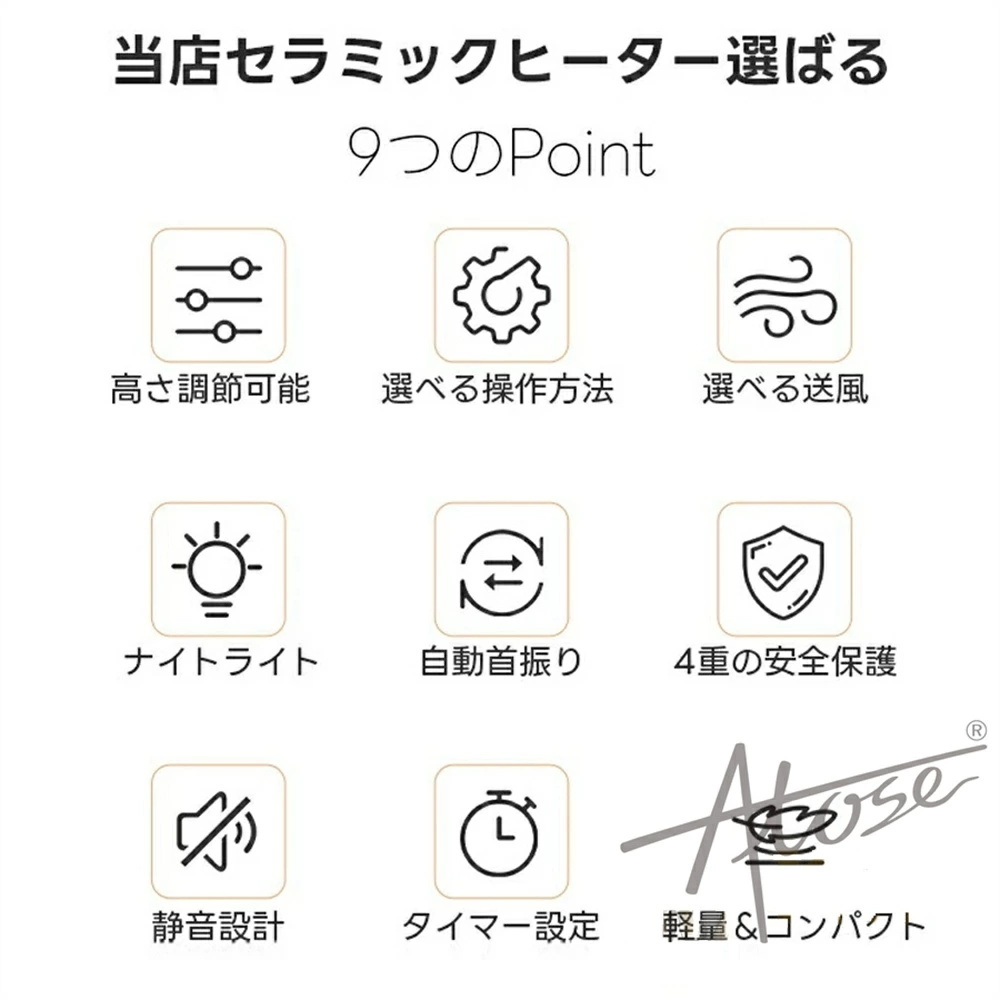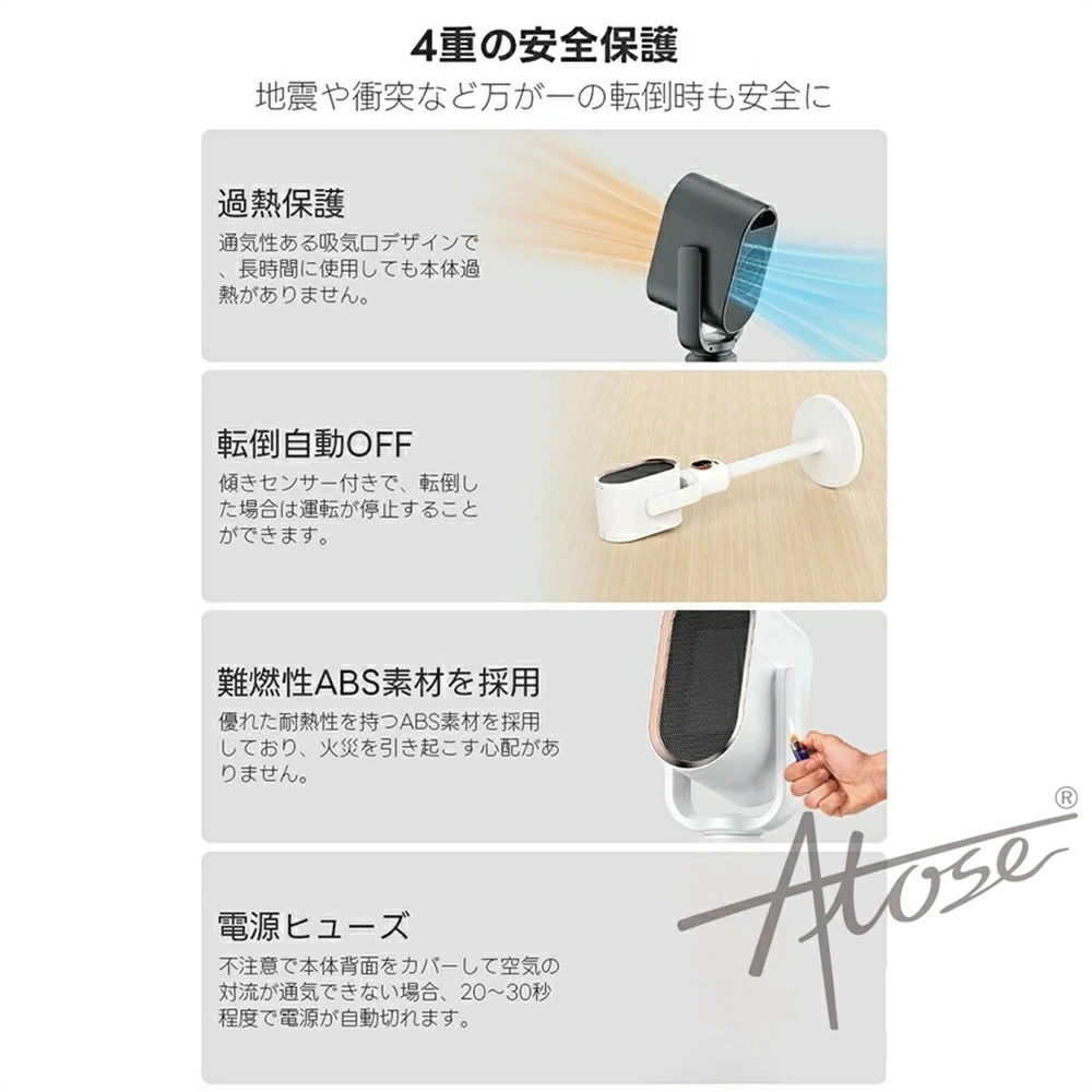 転倒自動OFF機能:地震や不意の転倒に備えた転倒時電源遮断装置を搭載しており、衝撃して転んだときに自動的に電源も切ります。 万が一不意の衝撃でもこの電気ヒーターが倒れても、自動的に電源が切ります。過熱防止機能:本体が連続運転によって過熱すると、自動的に過熱保護機能が起動され、電源が自動的に切ってくれます。直火なし:PTCセラミックを活用して発熱し温風で温めるため、ガスや石油などのオイルをを使わないため、明火なしに室内空気を汚さず、換気しにくい場所での使用にもビックリ!また本製品はPSE認証済み暖房器具です。赤ちゃんやペットのいるご家庭でも安心に使えます。