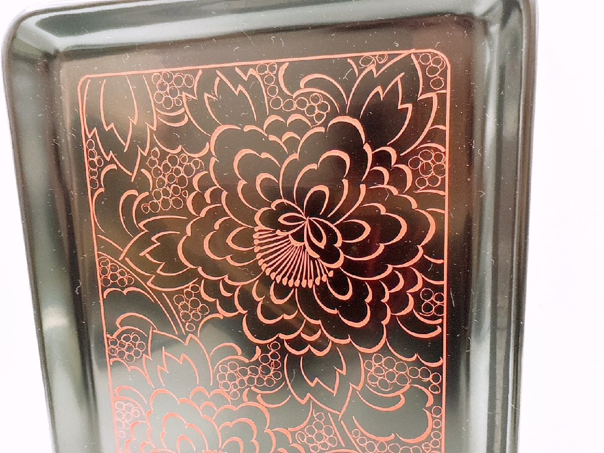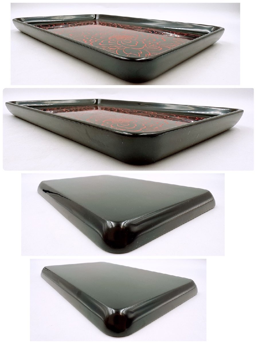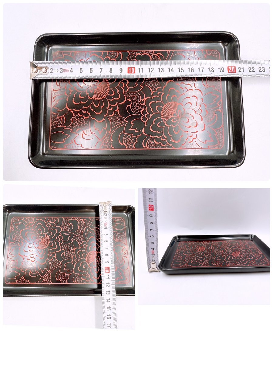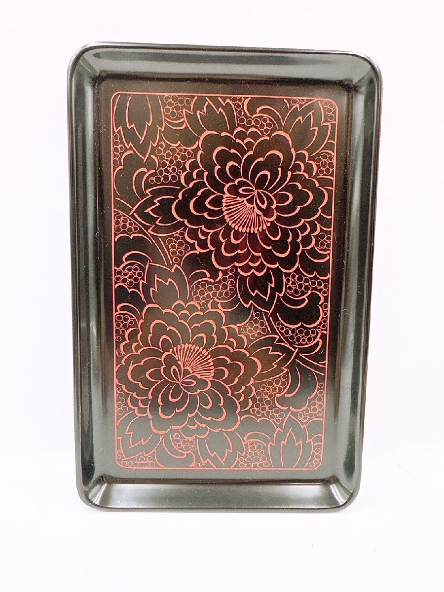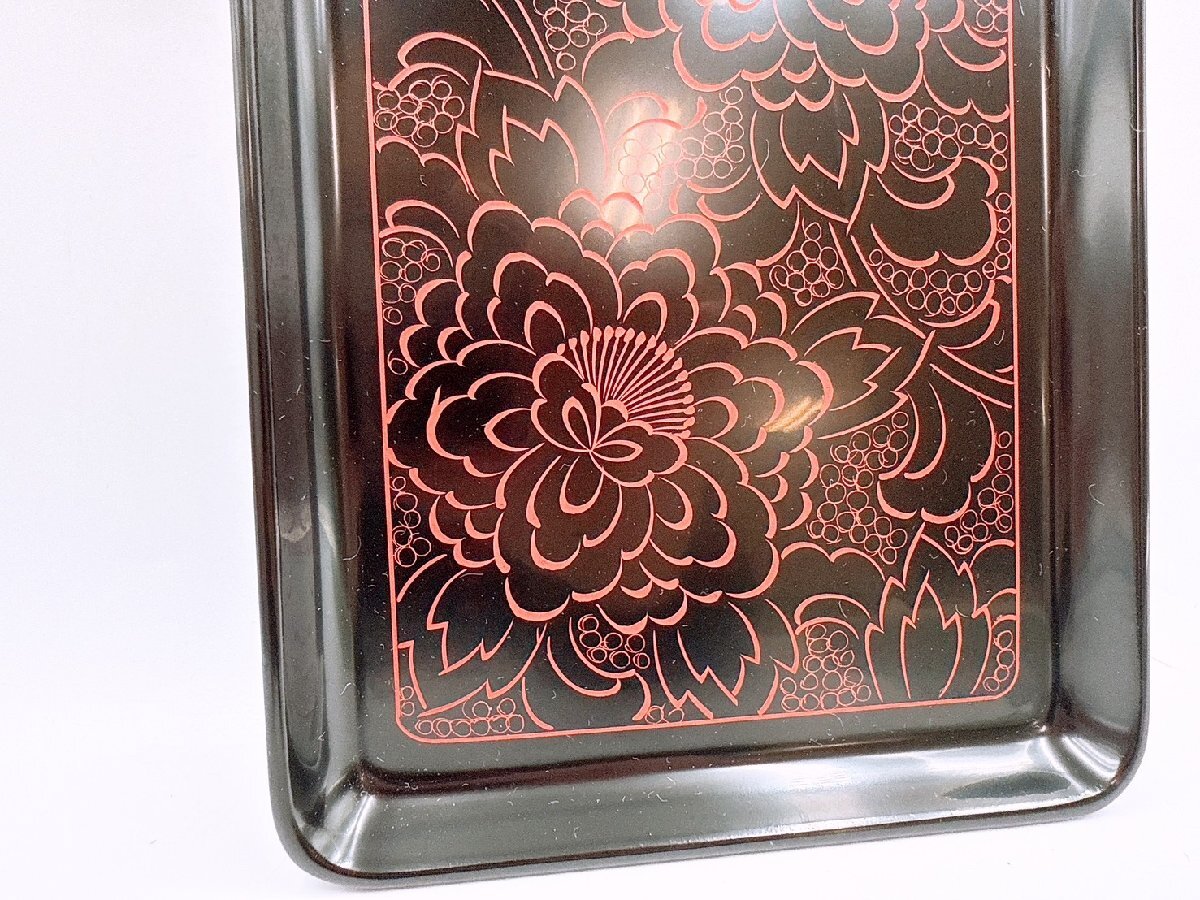 詳細:上品な黒塗りの長手盆です。表面には鮮やかな菊の花が美しく描かれたお品です。