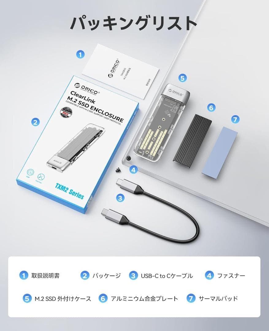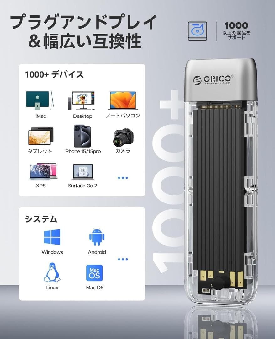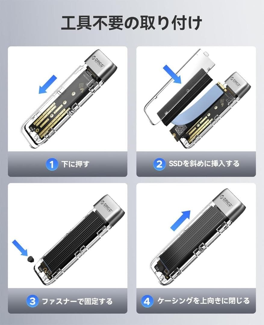 【透明&ツールフリーデザイン 】透明シェルデザインのORICO M.2 SSD 外付けケース、ユニークでファッショナブル。工具不要で取り付け可能。プラグインしてすぐに使用可能。工具なしでSSDを素早く取り付け、取り外すことができます。ドライバをインストールすることなく、デバイスと直接接続できます。