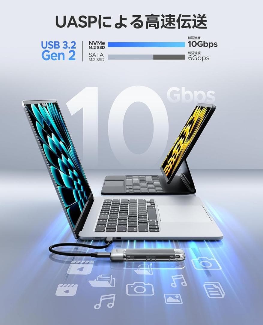 【高速転送】ORICO透明M2 ssdケース、NVMe / SATA 両対応、は最新のUSB C 3.2Gen2インターフェイスを採用し、UASPとTRIM機能も対応します、転送速度は最大10Gbps (M.2 NVMEプロトコルは10Gbps、SATAプロトコルは6Gbps)、1GBのファイルを1秒で転送します。