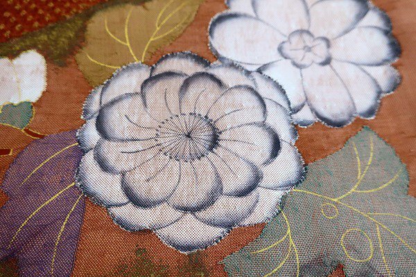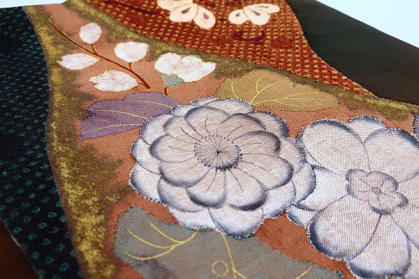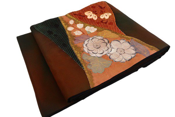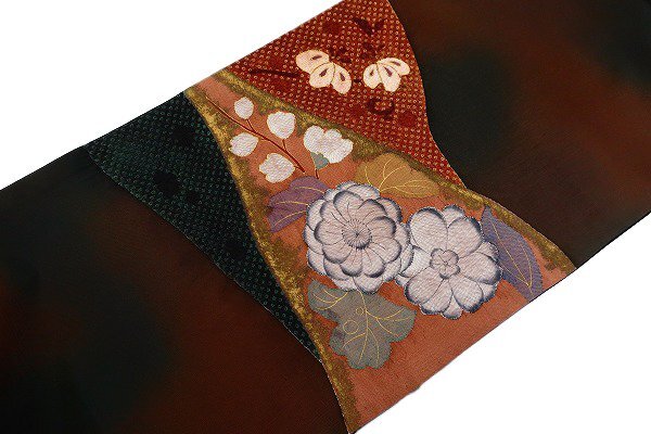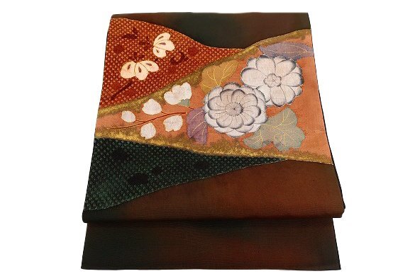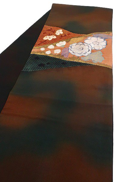 こげ茶のぼかし地に辻が花があしらわれた袋帯です。 柄の一部には絞りが入っており、大変お洒落な一本です。 未使用品です。 担当:伊藤 |