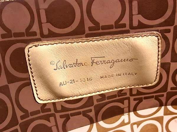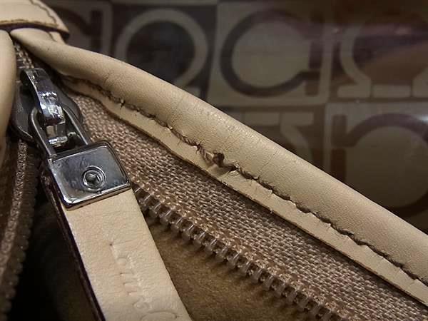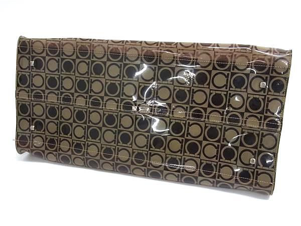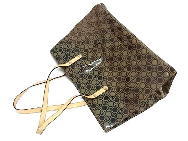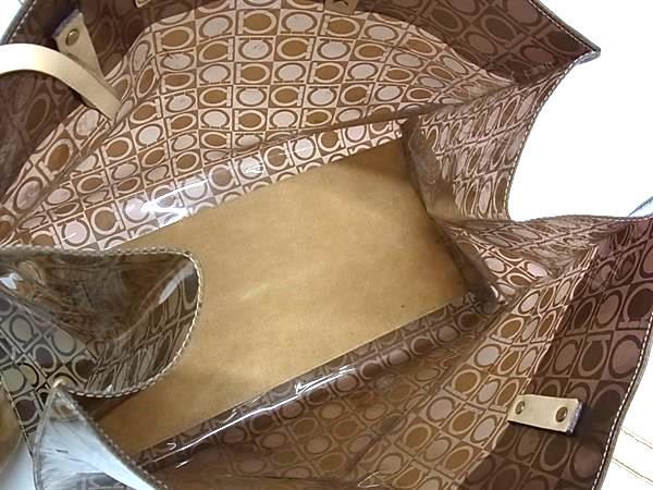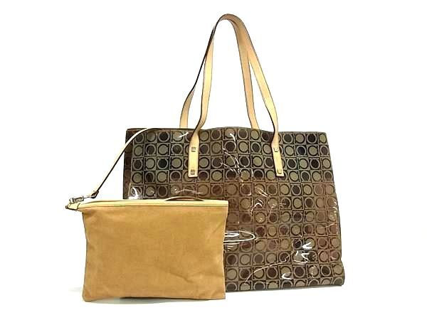 1円 Salvatore Ferragamo フェラガモ ガンチーニ柄 ビニール×レザー ポーチ付き ショルダー トート ハンドバッグ ブラウン系 FS5494