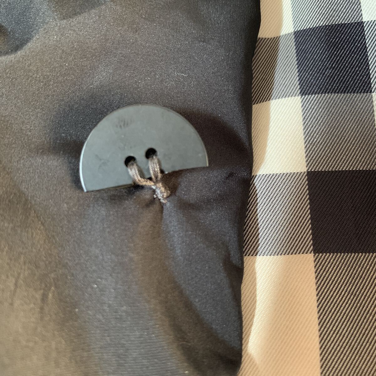 BURBERRYのブラックダブルブレストトレンチコート、内側はチェック柄でスタイリッシュ。