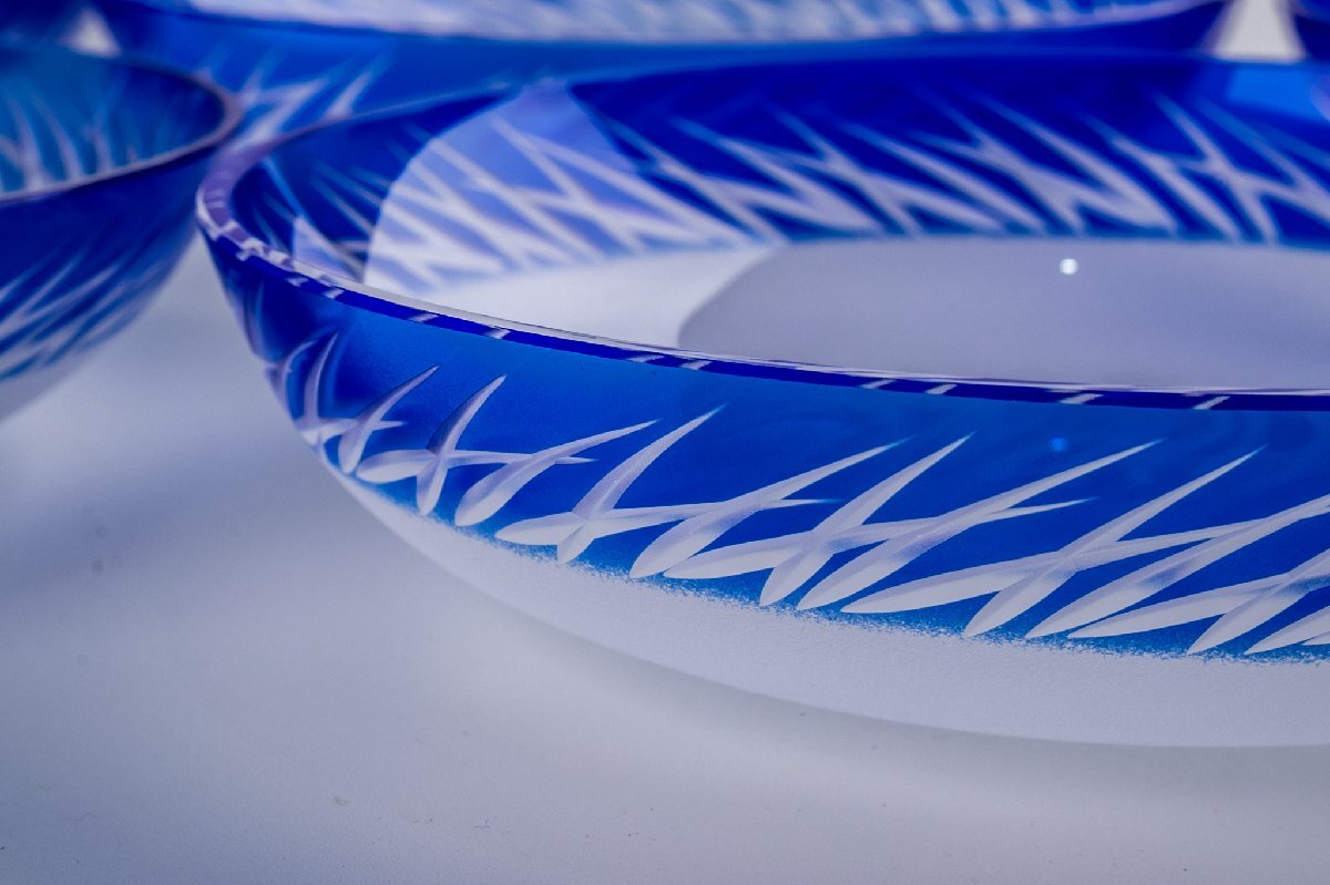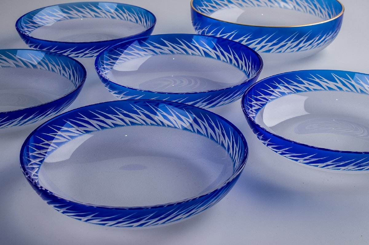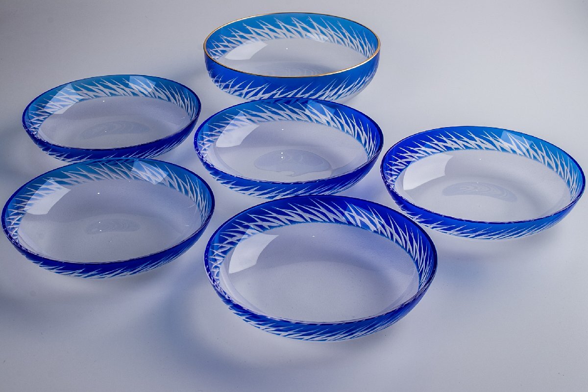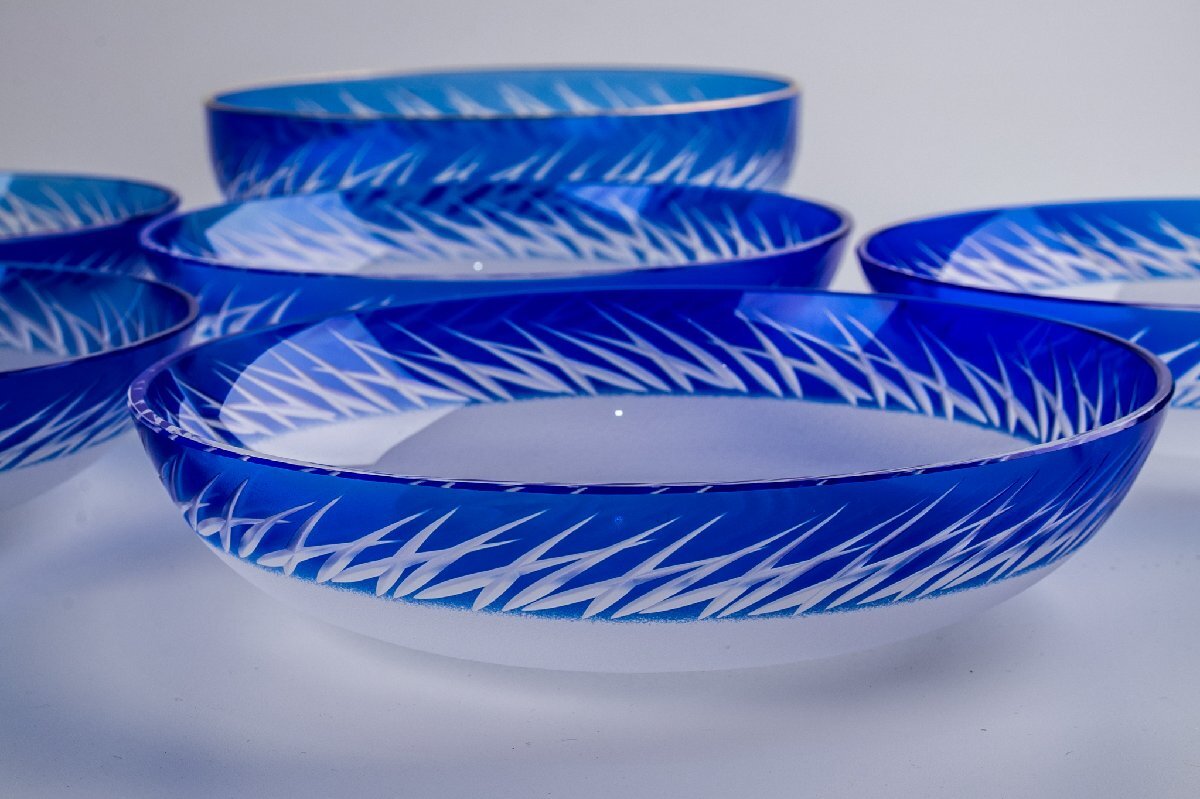 【うつわ】 河上恭一郎 瑠璃夏草文切子皿 6客 共箱 F086 古美術 骨董 古玩 茶道具 日本料理 料亭 懐石