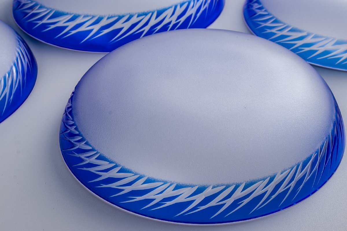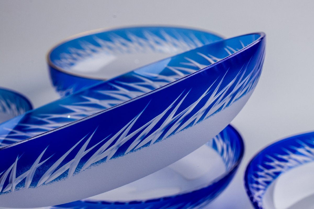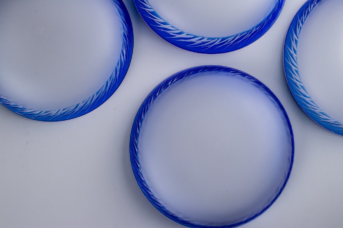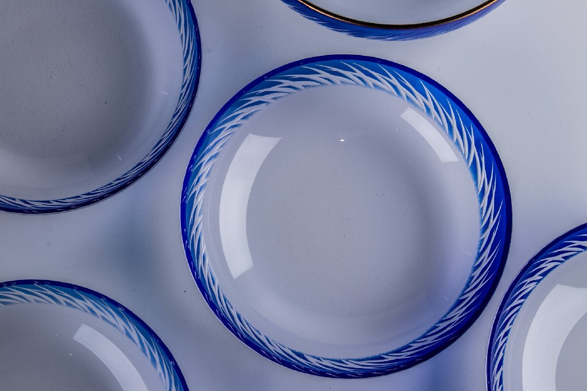【うつわ】 河上恭一郎 瑠璃夏草文切子皿 6客 共箱 F086 古美術 骨董 古玩 茶道具 日本料理 料亭 懐石