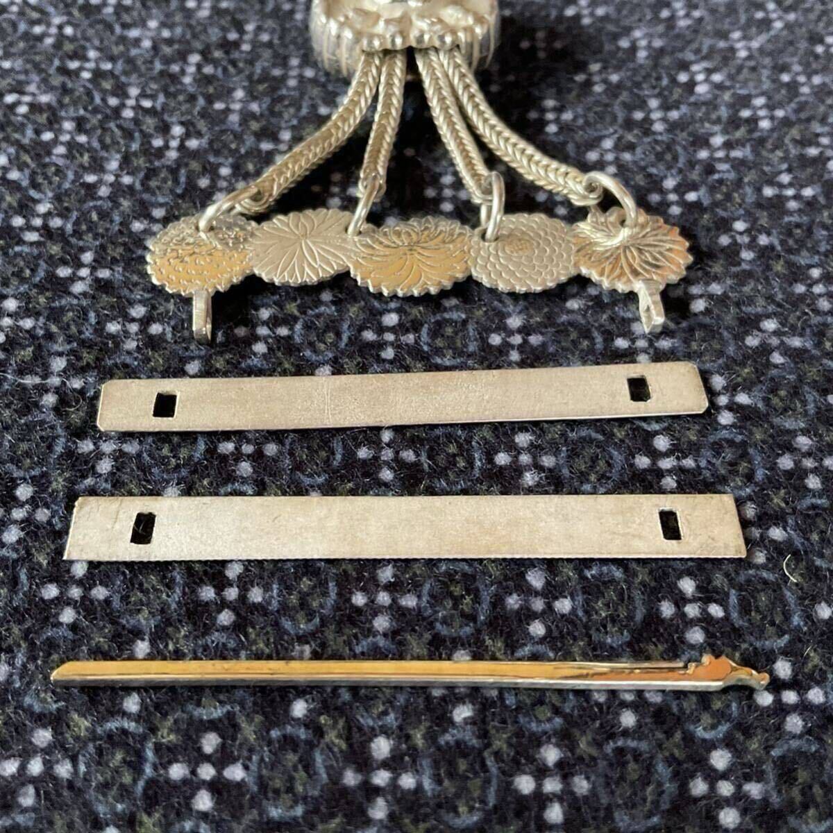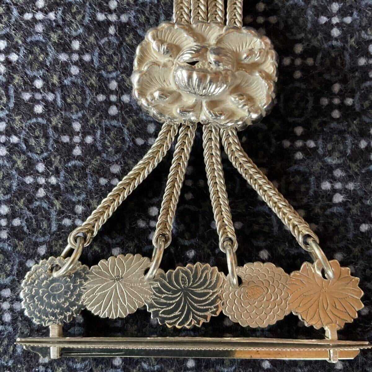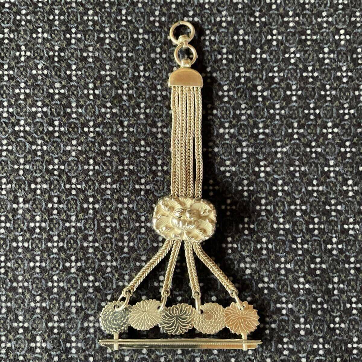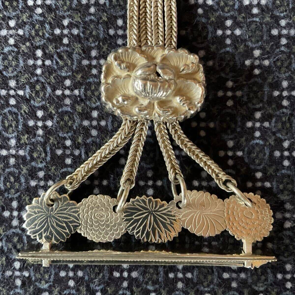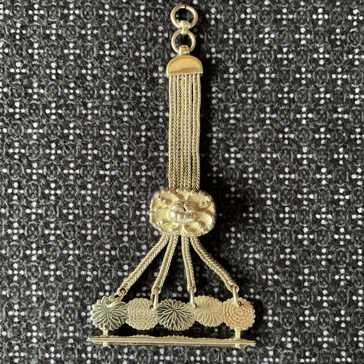 商品名:時代物 蔵出し【華柄彫金細工金具 鍍銀 煙草入れ 提げ物 根付 四連鎖金具 彫刻金具】