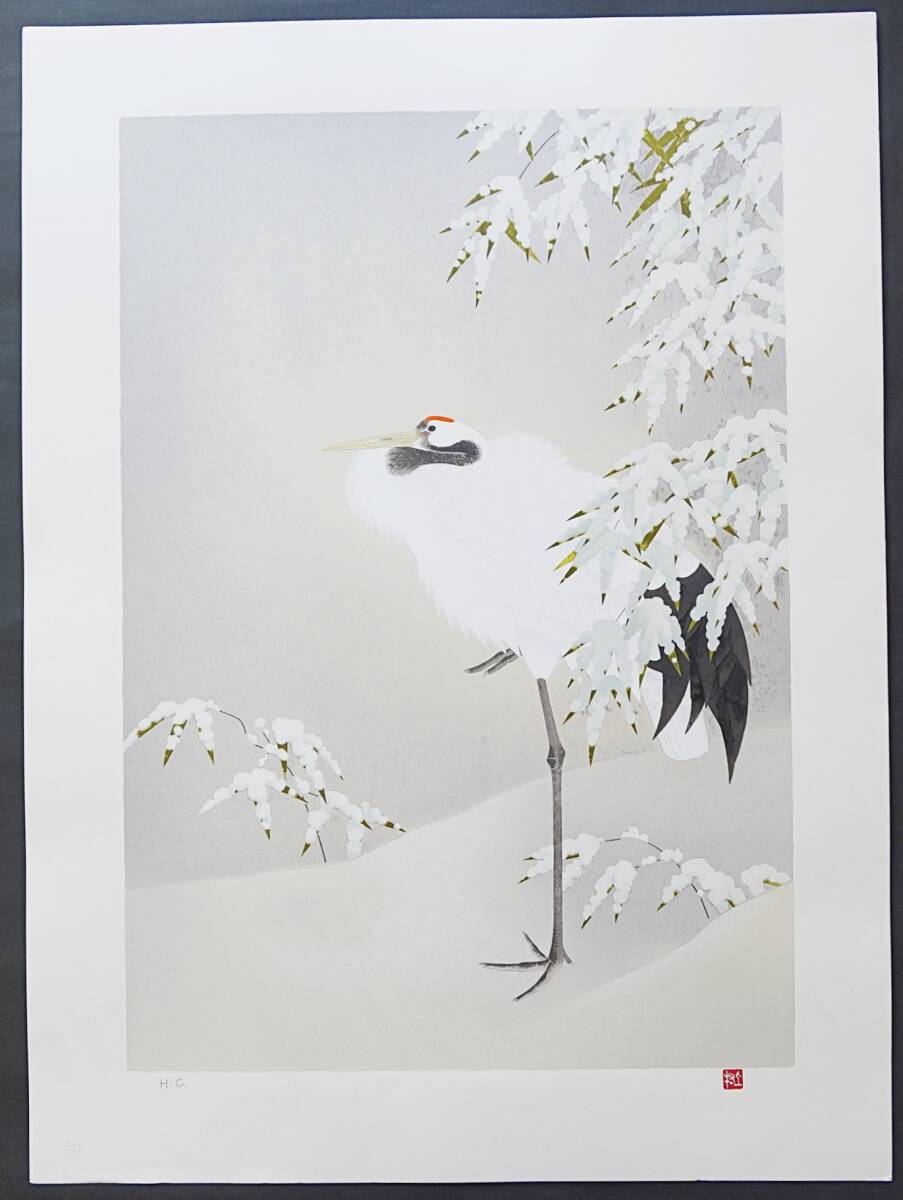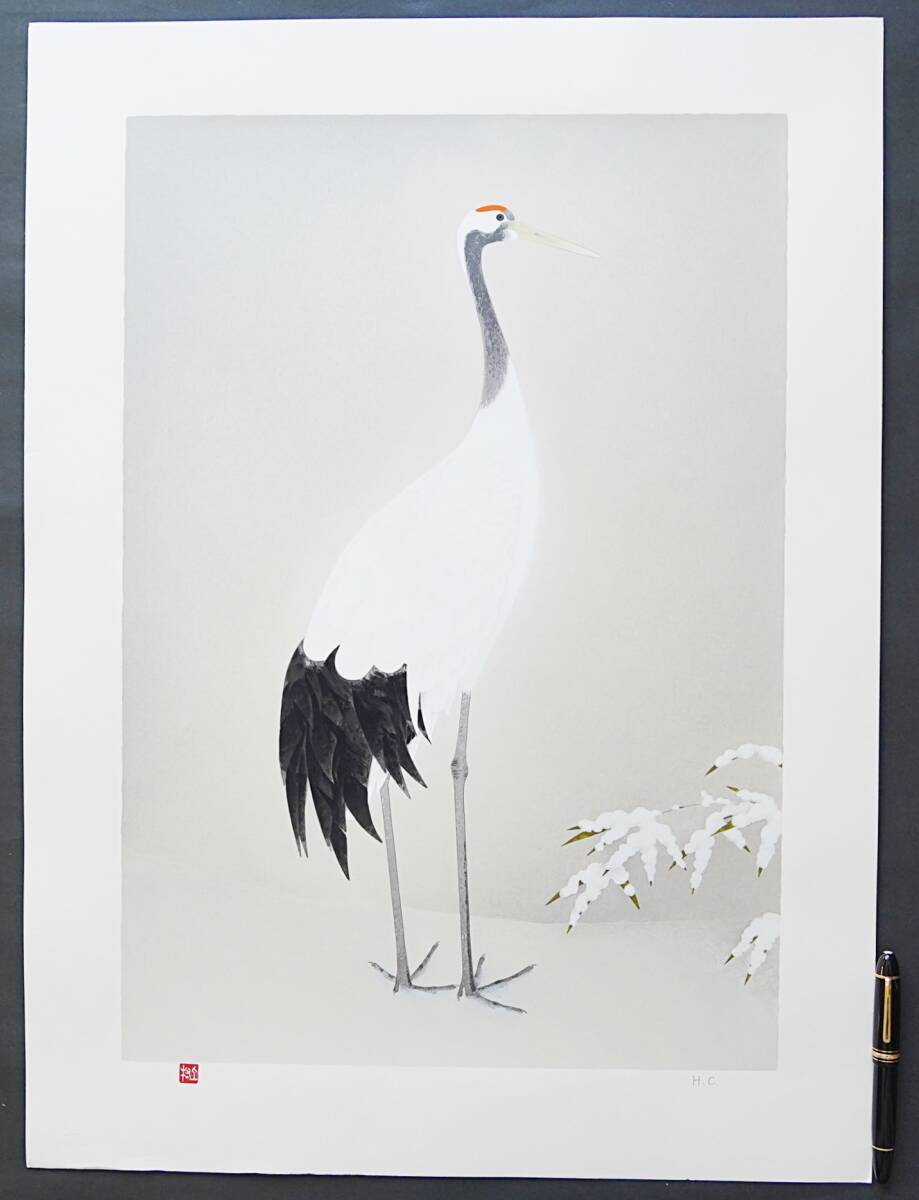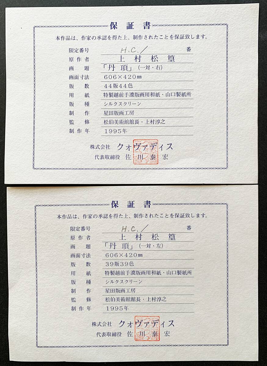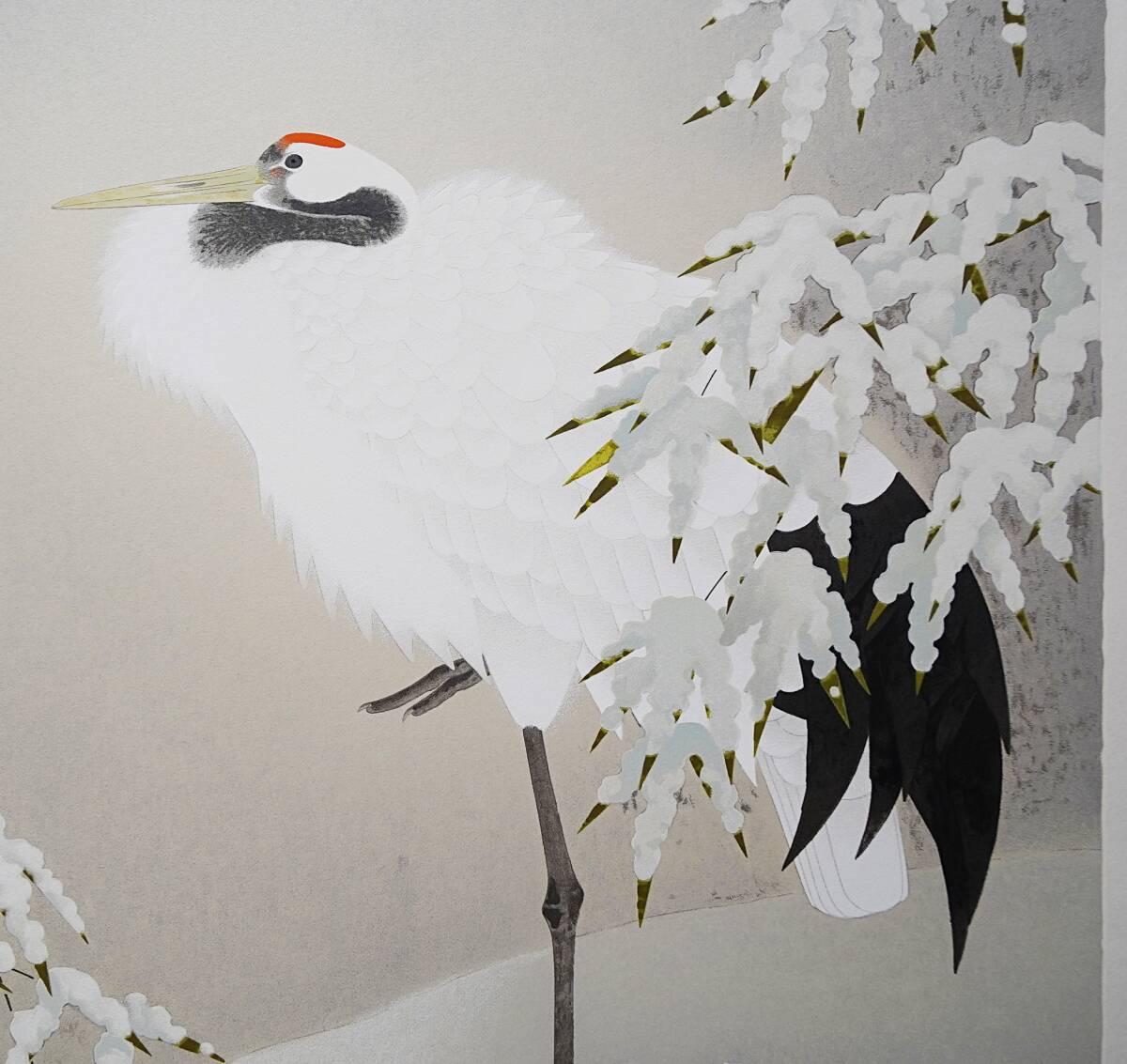 『丹頂』(左右一対) 証明書2枚付属 シルクスクリーン2枚 限定250部 非売品(H.C.版) マージン部に監修者・上村淳之落款入 1枚シートサイズ:(約)74x54cm イメージサイズ:(約)60.6cmx42cm ●上村松篁(うえむら しょうこう, 日本画家、上村松園の長男、上村淳之の親)1902年 京都生まれ1921年 帝展初入選1959年 芸術選奨文部大臣賞を受賞1967年 日本芸術院賞を受賞1981年 日本芸術院会員となる1983年 文化功労者に選出される1984年 文化勲章を受章2001年歿、享年98歳花鳥画の伝統を基盤にしつつ、自然への観察と品格ある装飾性を兼ね備えた作品を制作。花鳥画を単なる写実にとどめず、生命感と静謐な詩情を重視。「松園の人物画」「松篁の花鳥画」「淳之の動物画」と称される上村家三代の芸術は、日本画の継承と革新の象徴とされています。※本作品が万一、公定鑑定人、または公定鑑定機関により、 真作でないという判断がされた場合は、返品・全額返金を受け付けます。 ※商品ご落札日より1週間以内に鑑定される旨をご連絡下さい。 ※鑑定料、鑑定に伴う諸経費は落札者様のご負担となりますので予めご了承下さい。 ■コンディション額は付属しません。版画のみの出品です。マージン部に小ジワ、裏面に微小なシミがある以外は特に問題は有りません。