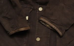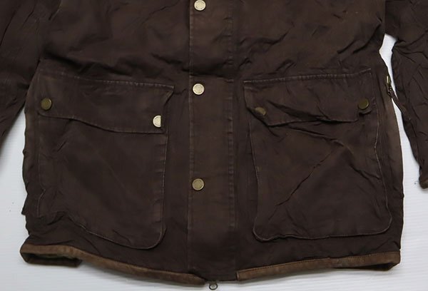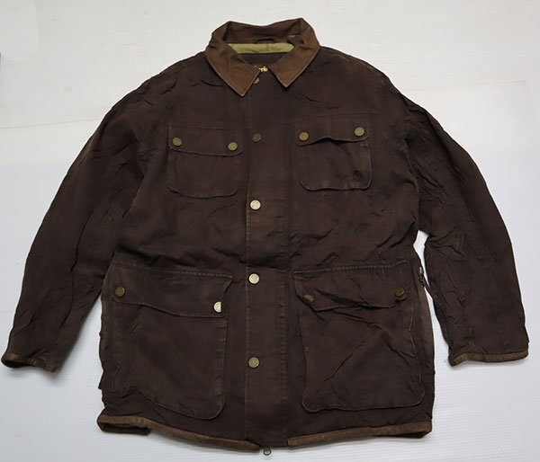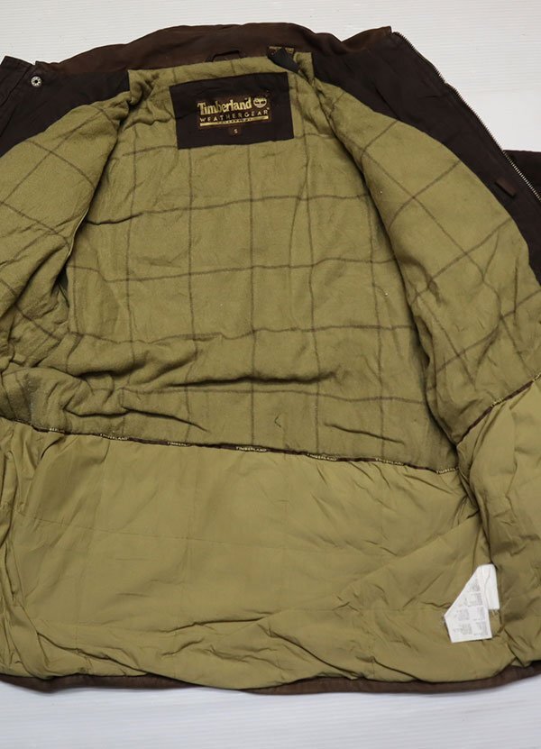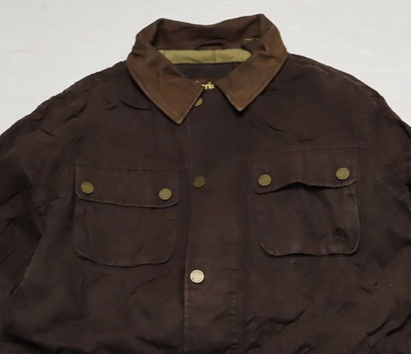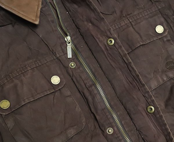 アメリカ買い付けのTIMBERLANDのオイルドコットンジャケットの襟&裾&袖口はレザーの茶系です。