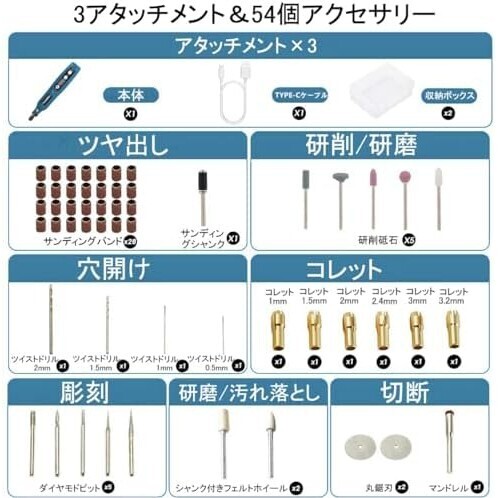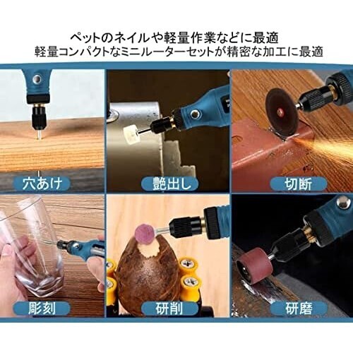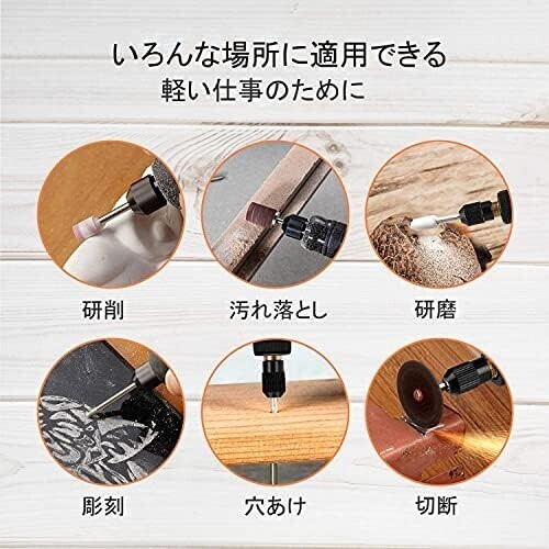 ガラス彫刻や金属研磨・穴あけ・つや出し・模型工作などに対応できる、DIYや趣味など幅広い場所で使い