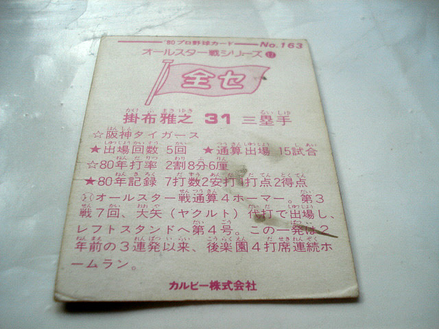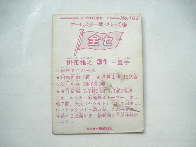 カルビー 1980年 163番 掛布雅之 阪神タイガース オールスター戦シリーズ17 '80オールスター戦 '80プロ野球カード