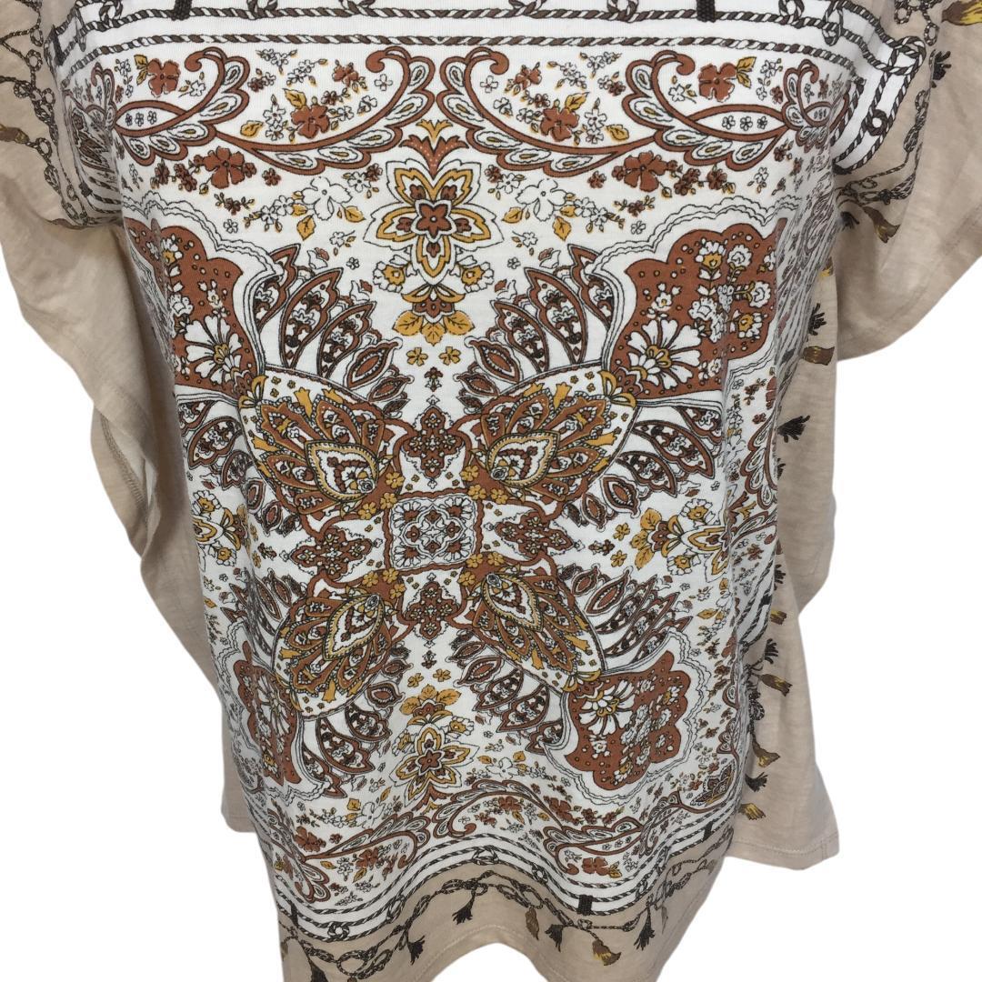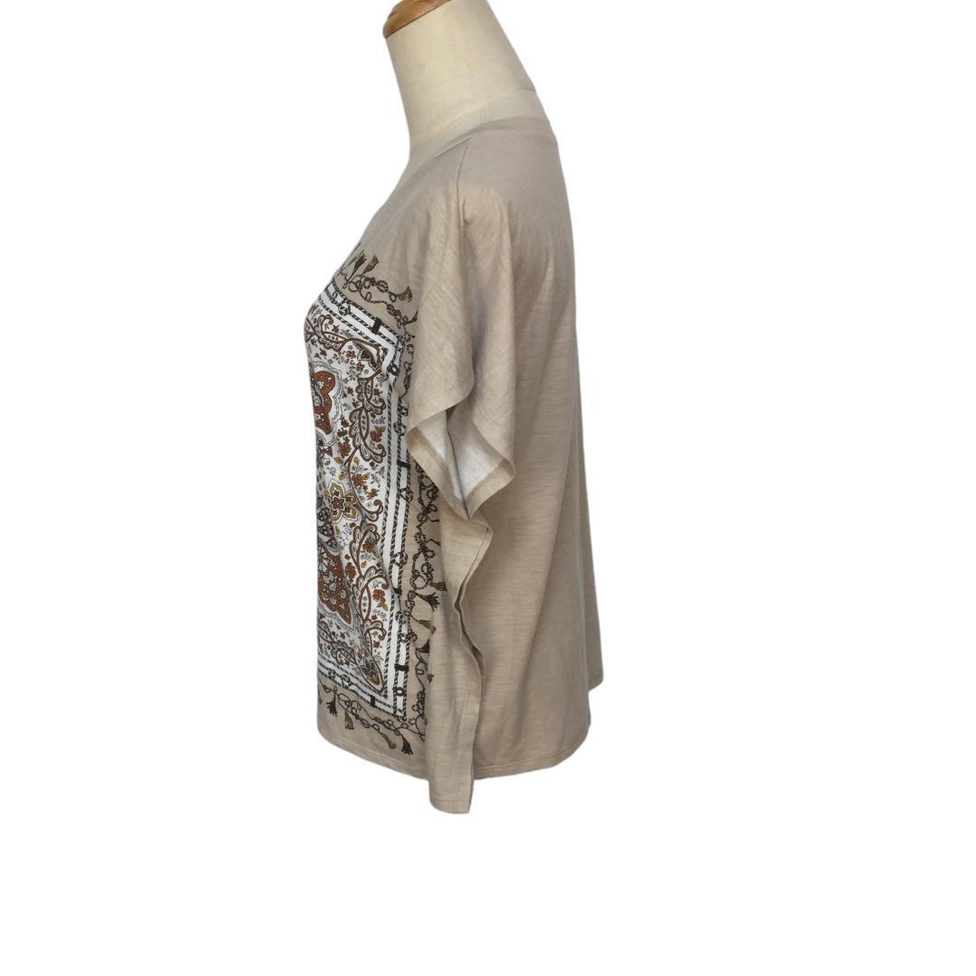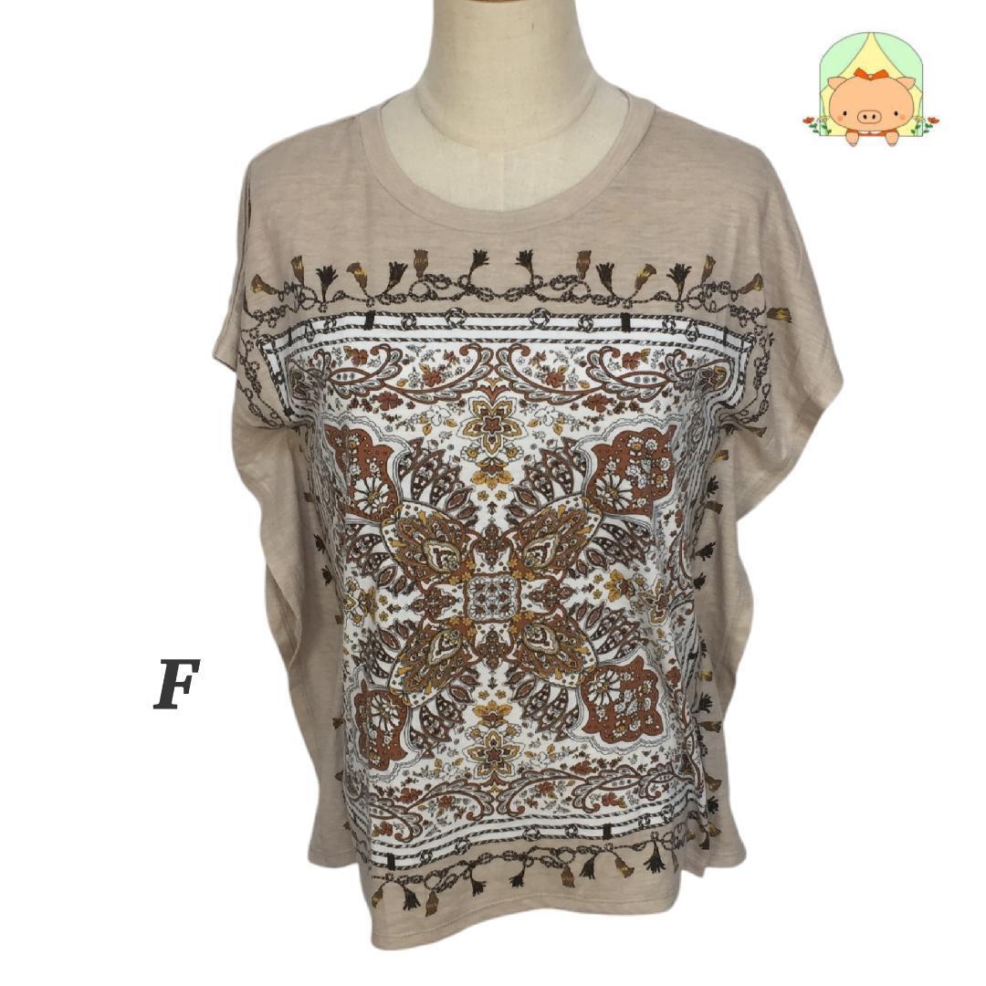 華やかなペイズリー柄が印象的なドルマンスリーブTシャツゆったりシルエットで体型カバーも◎さらっとしたレーヨン混素材で着心地も快適。落ち着いたベージュ系で大人カジュアルにぴったり♪Fサイズ・即購入OK!