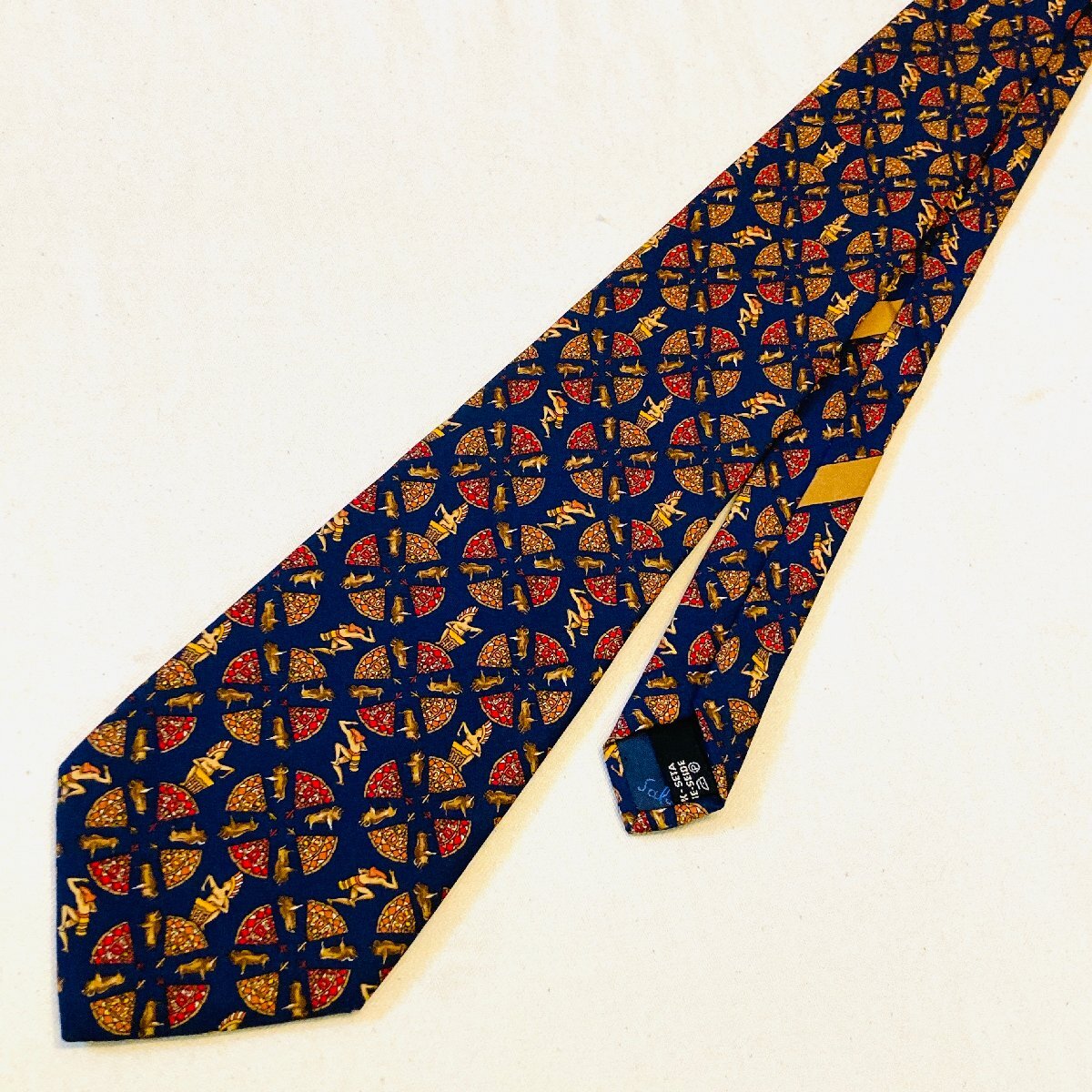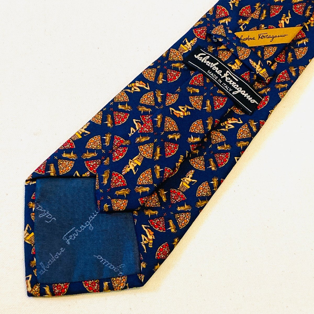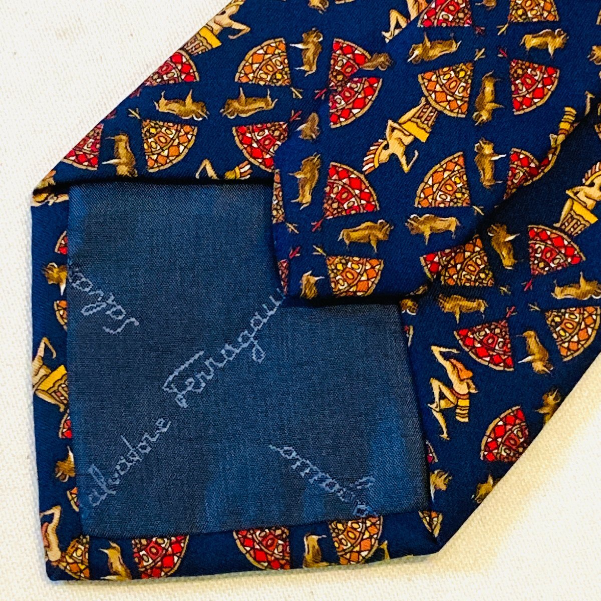 Salvatore Ferragamo サルヴァトーレフェラガモ イタリア製 絹 シルク SILK 100% 高級 ネクタイ ネイビー系 総柄 アニマル柄 民族