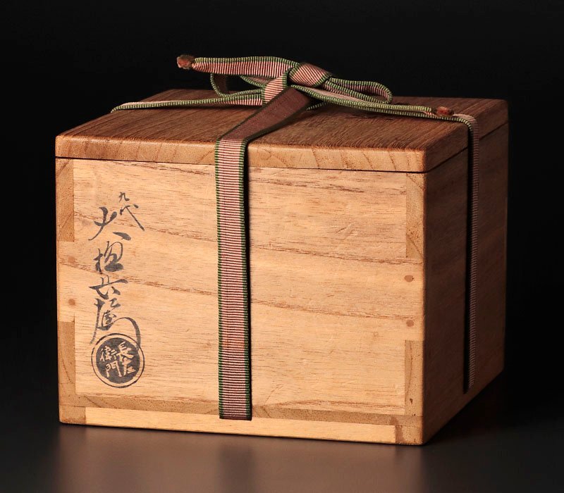 【九代大樋長左衛門】:1901(明治34)年 - 1986(昭和61)年 本名:長二、号:陶土斎。石川県出身、石川県立工業学校窯業科卒。師、8代大樋長左衛門。日本工芸会正会員。石川県立工業学校を卒業後は家業に専念し1920年に農商務省工芸展で初入選、25年には家督を継ぎ9代大樋長左衛門を襲名、ひたすら伝統の陶技を研究し36年の個展「茶碗12ヶ月展」では高い評価を得、40年に近衛文麿より長左衛門印を拝領、42年には工芸技術保存者に認定、58年より日本伝統工芸展に出品、入選を重ねる。幕釉黒茶碗や飴釉茶碗をはじめ茶陶専門に制作し昭和以降の大樋焼確立に大きく貢献、歴代長左衛門の中でも特に名工と称された。 |