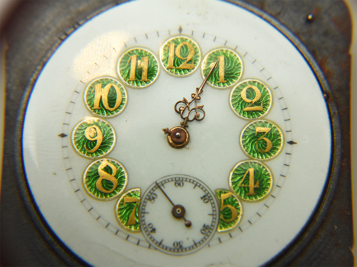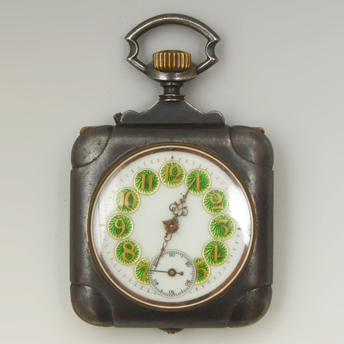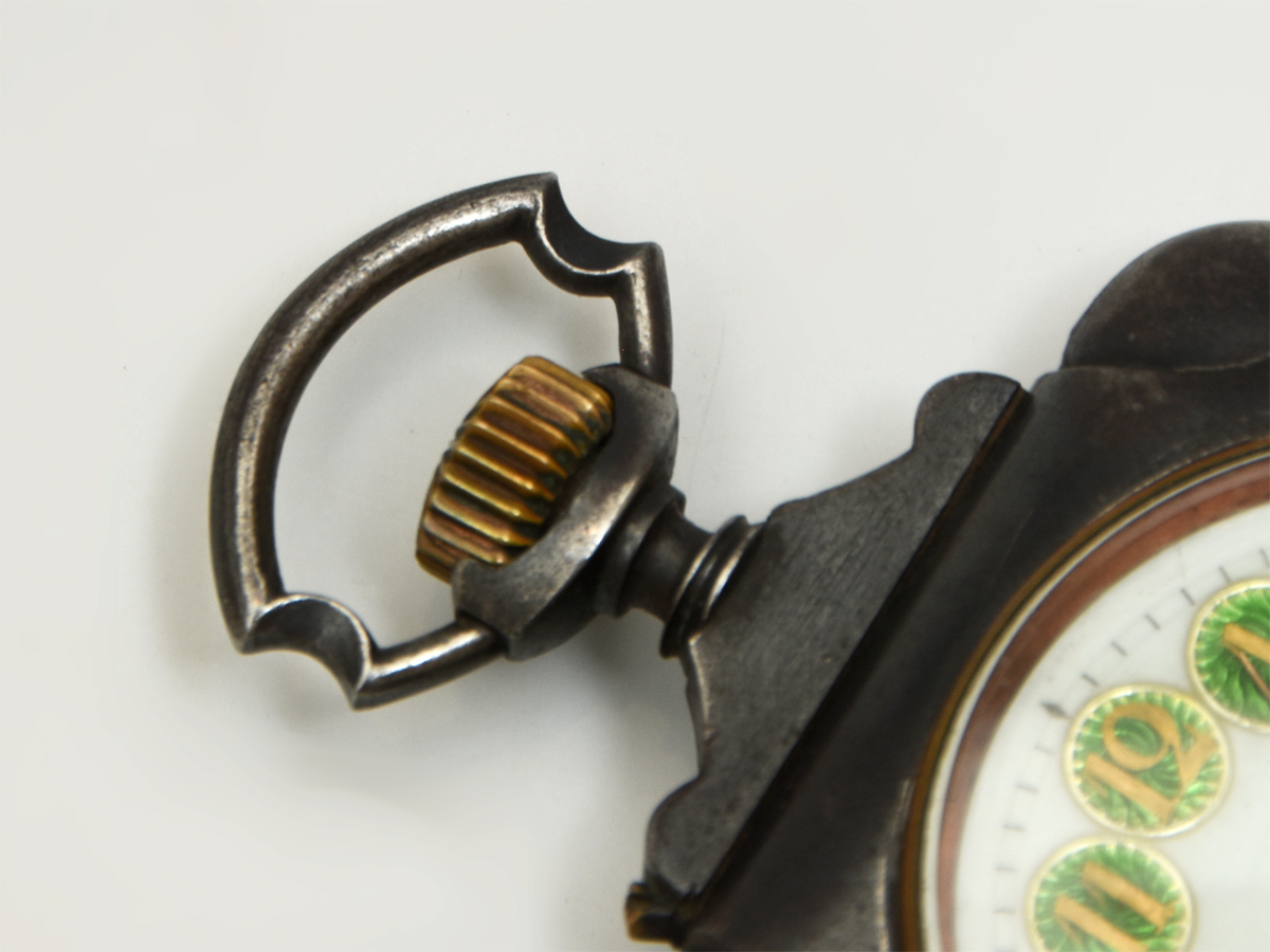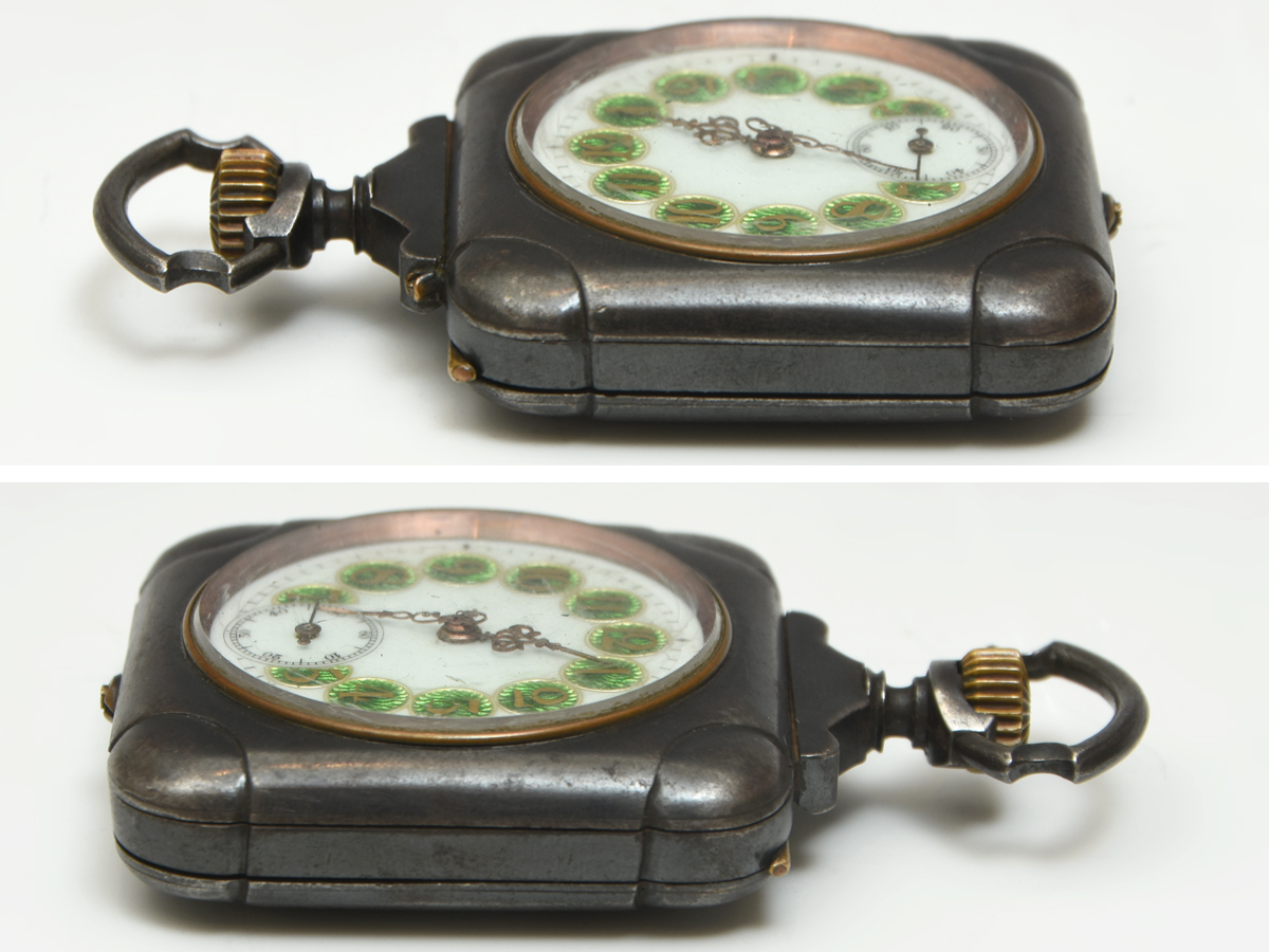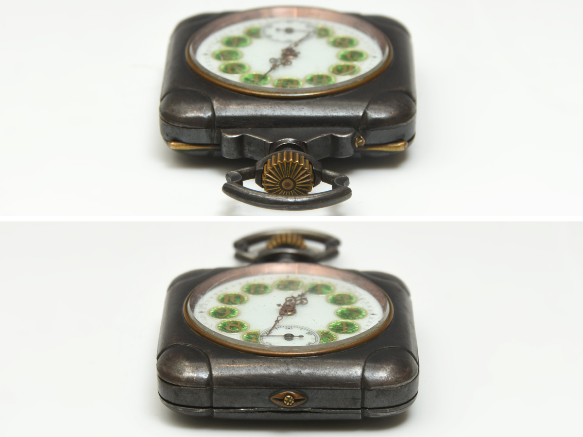 特徴的な角型ケースに、緑と金の装飾が印象的なアンティーク懐中時計です。 文字盤中央には繊細な針が配され、優美なデザインが時代の趣を伝えます。 avance / retard の刻印あり。 ゼンマイを巻くと秒針が動きました(動作保証なし) 長針が折れています(部品あり) ※撮影の際に生じた写り込みなどがございます。 ご理解の程よろしくお願い致します。 |