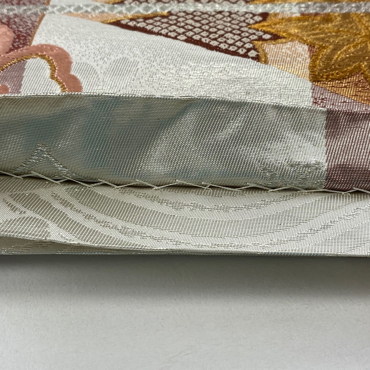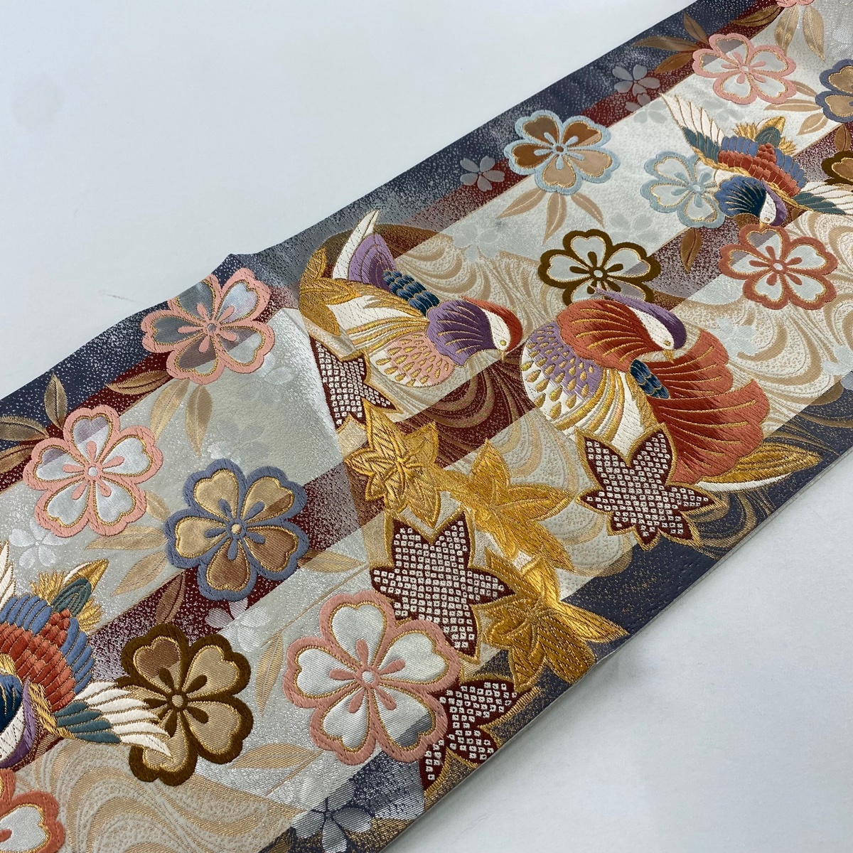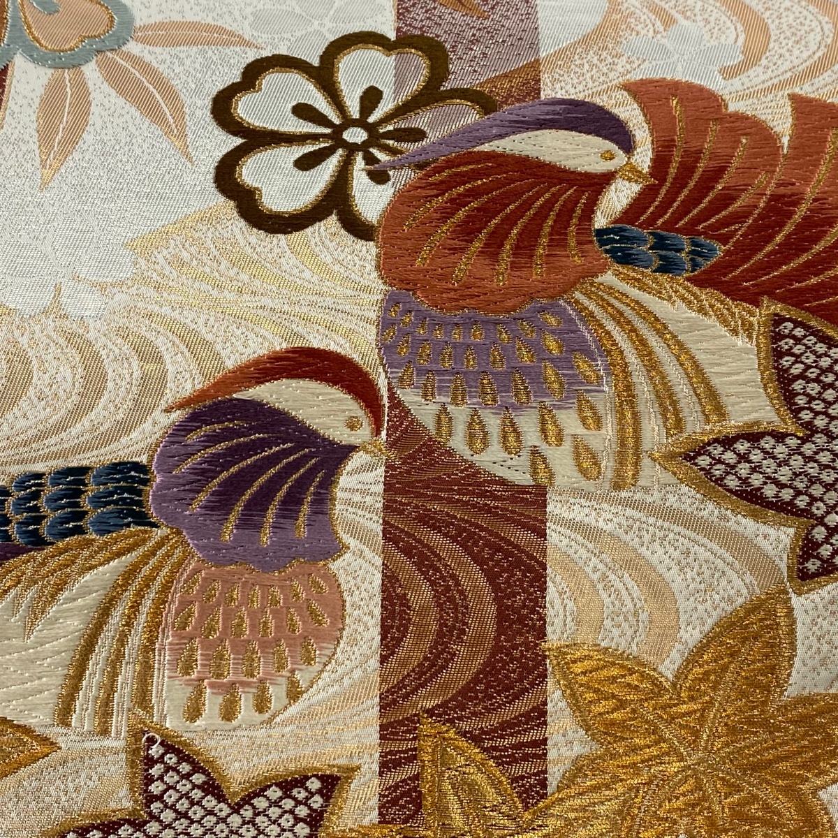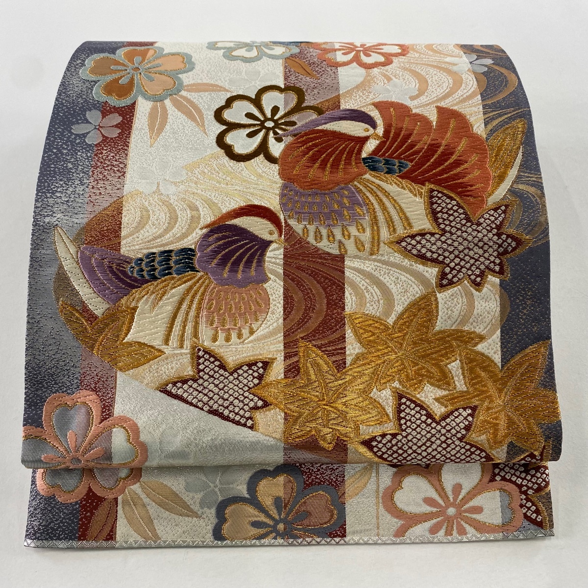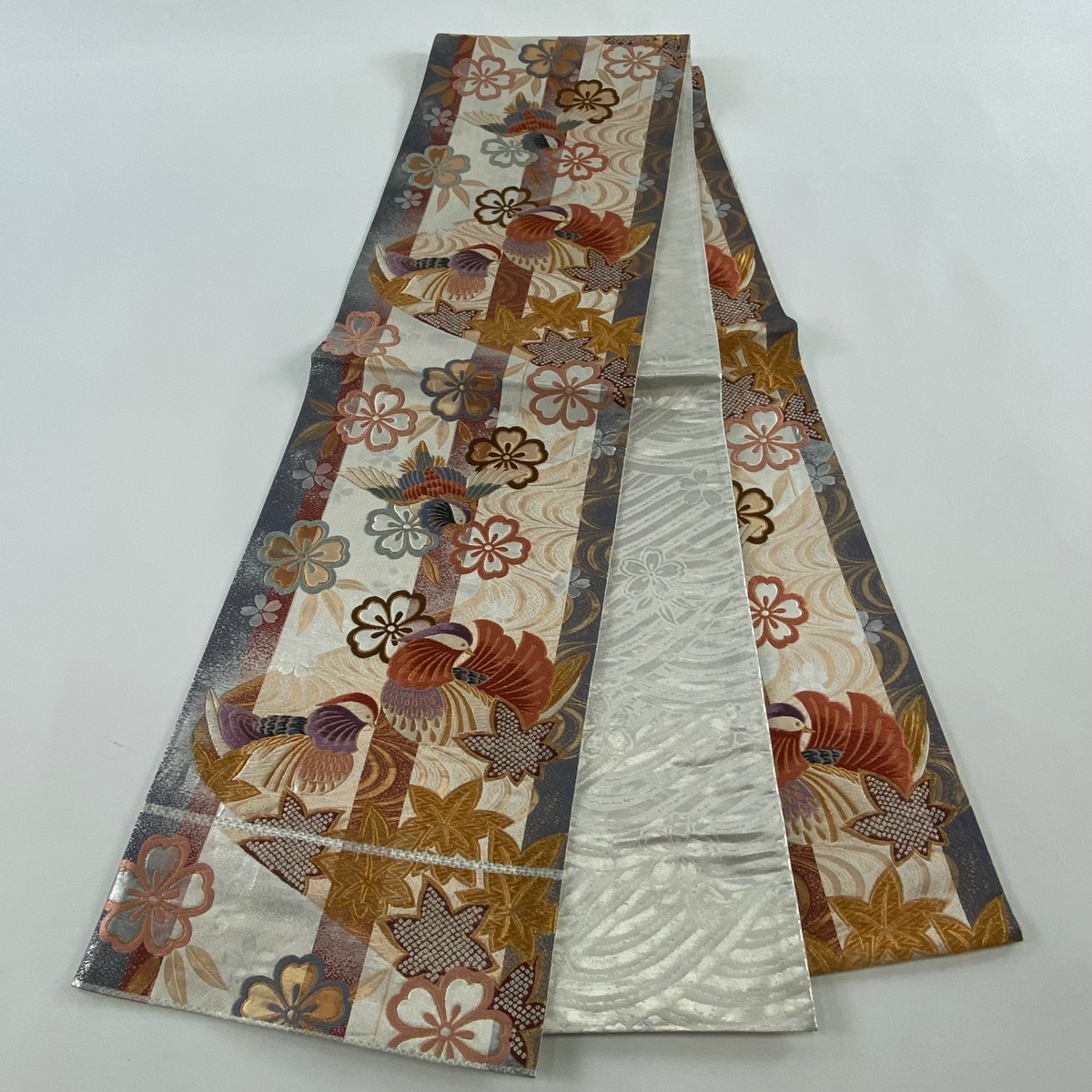 | 袋帯 美品 秀品 振袖向き 関西仕立て 鴛鴦 桜 箔 金糸 クリーム 全通 正絹 【中古】 |