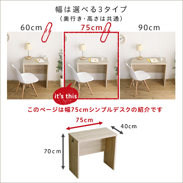 【ポイント】 子どもから大人まで使えるリビングに合うシンプルデスク75cm幅です。 教科書&ノートを広々置ける学習机に! 趣味や家事のワークスペースとしても使えます。 しっかりした厚みの天板はキズや書き跡に強いPVC仕様です。 デスクのサイドにはランドセルやバッグが掛けれるフック付きです。 デスクの背面にはライトやパソコンのコードを通せる隙間を作っているので、スッキリ収納できます。 |