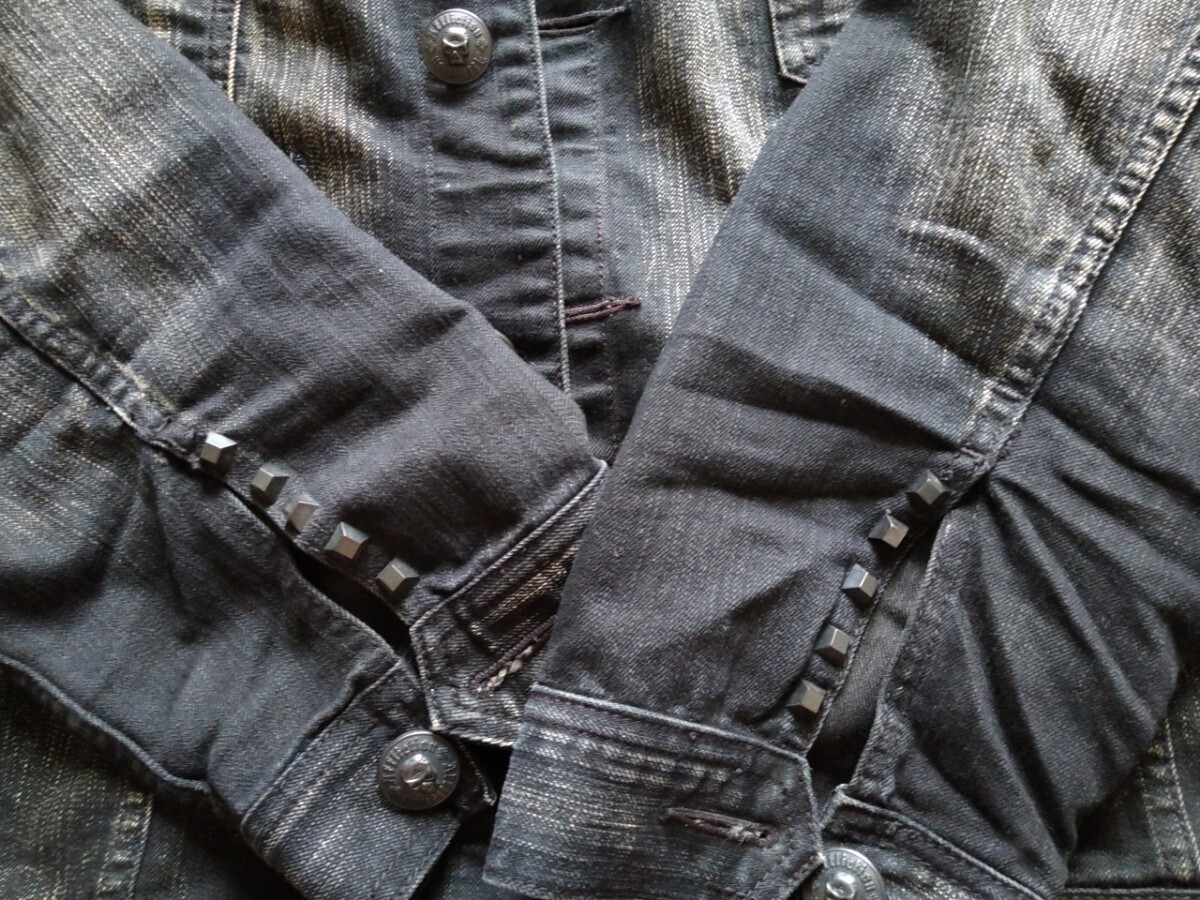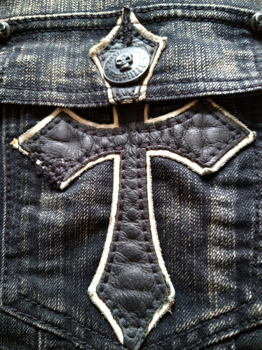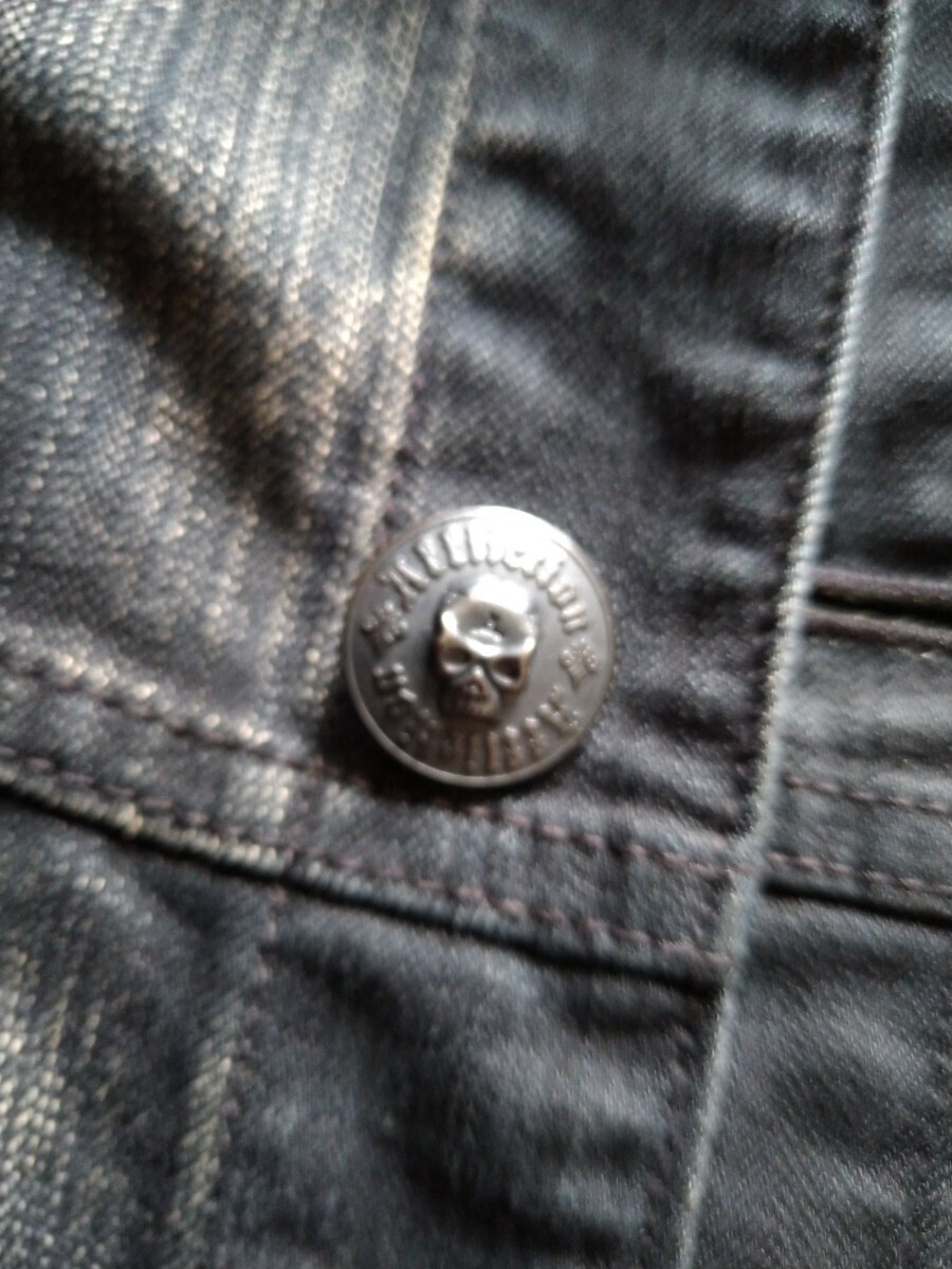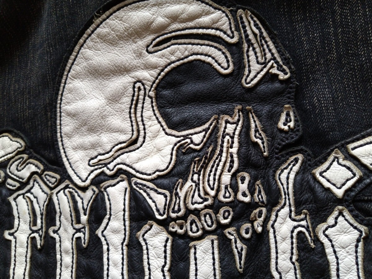 レザーワッペンとスカルボタン、左肩部分のインパクトがかなり強く古着感も相まって