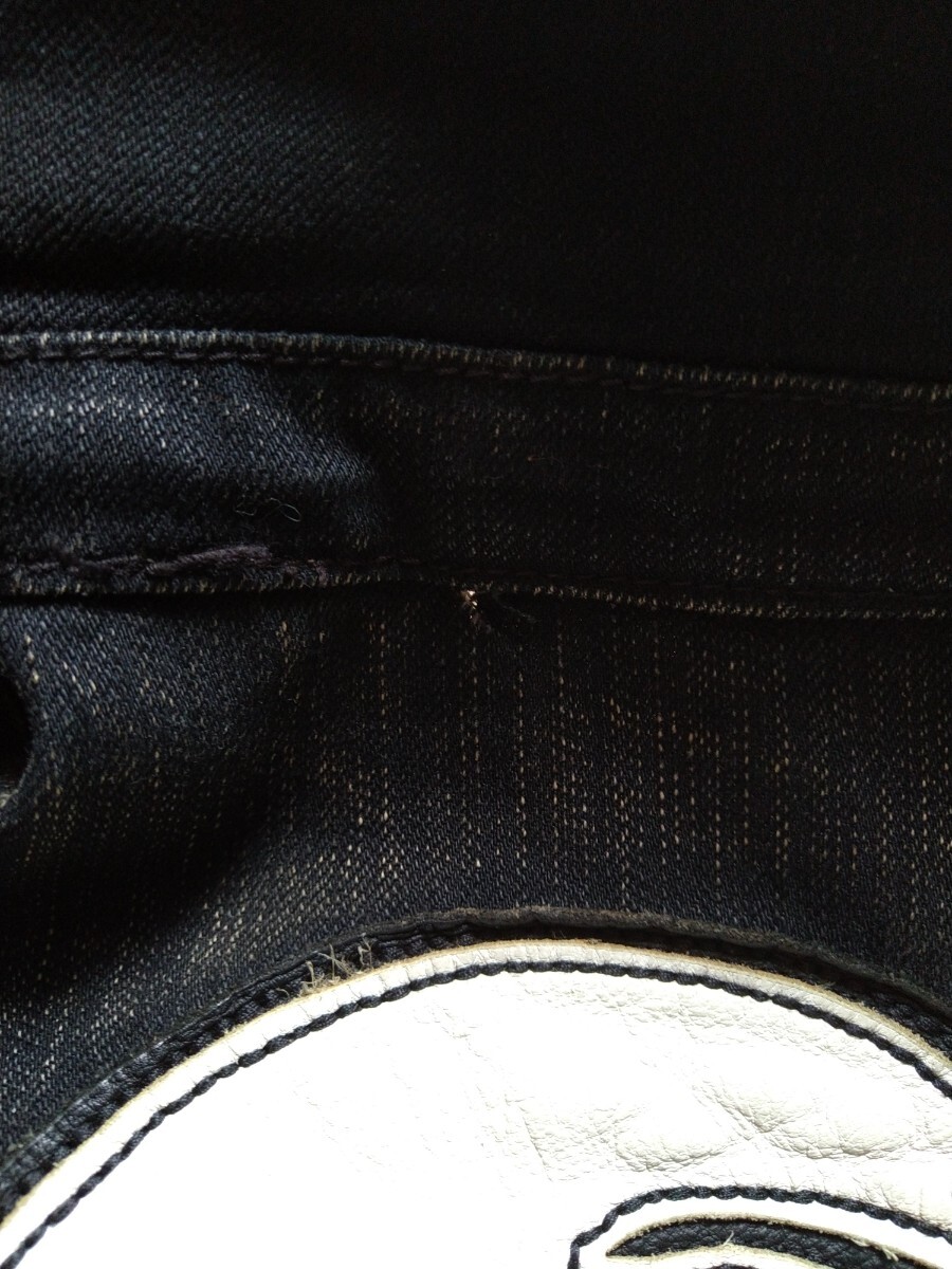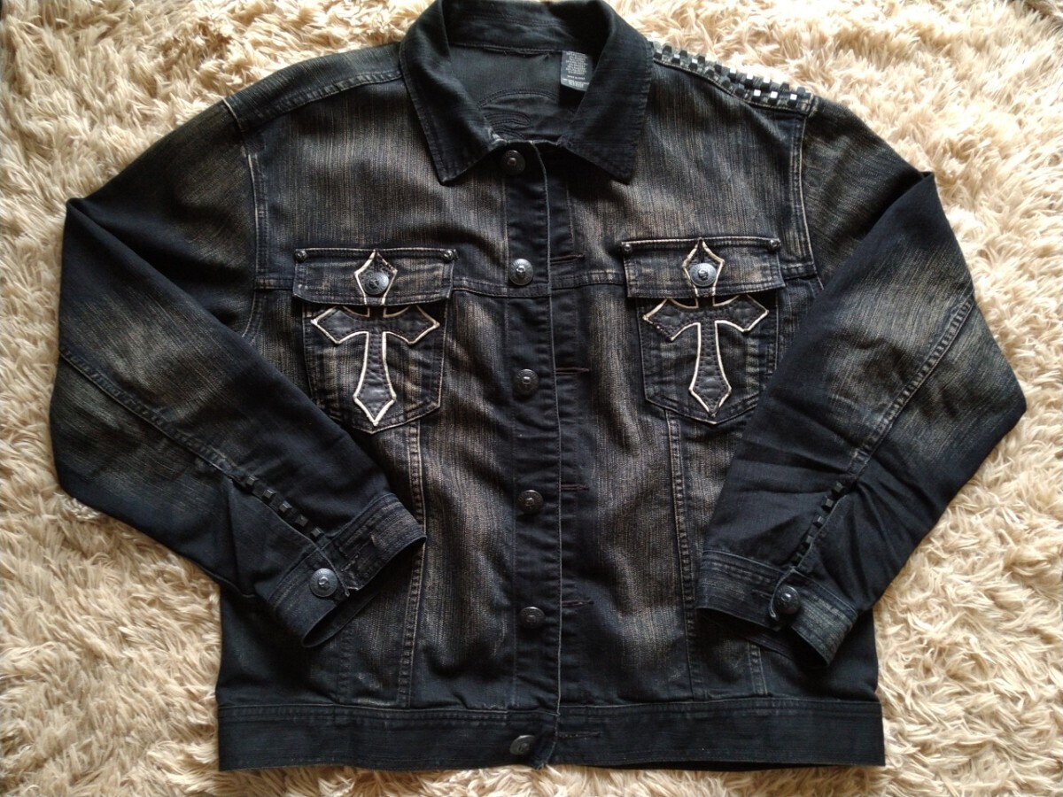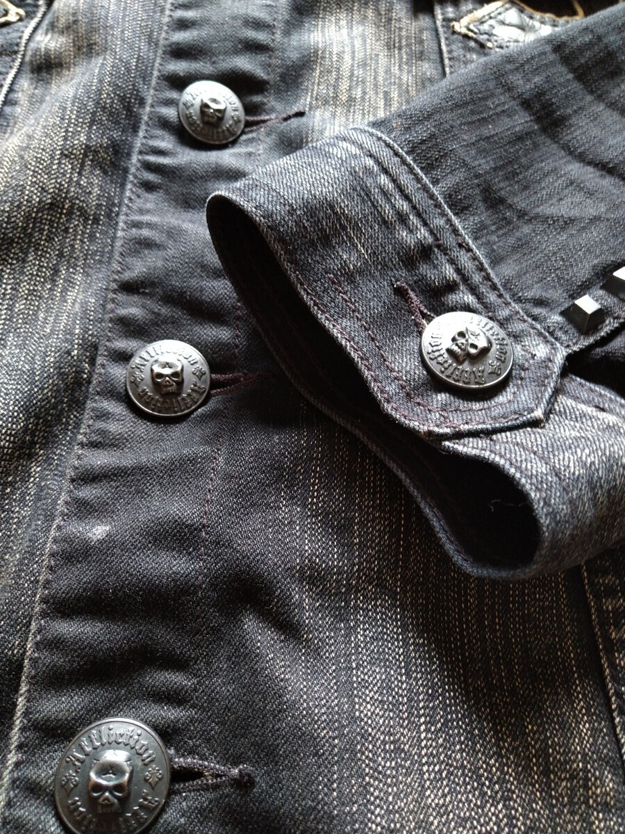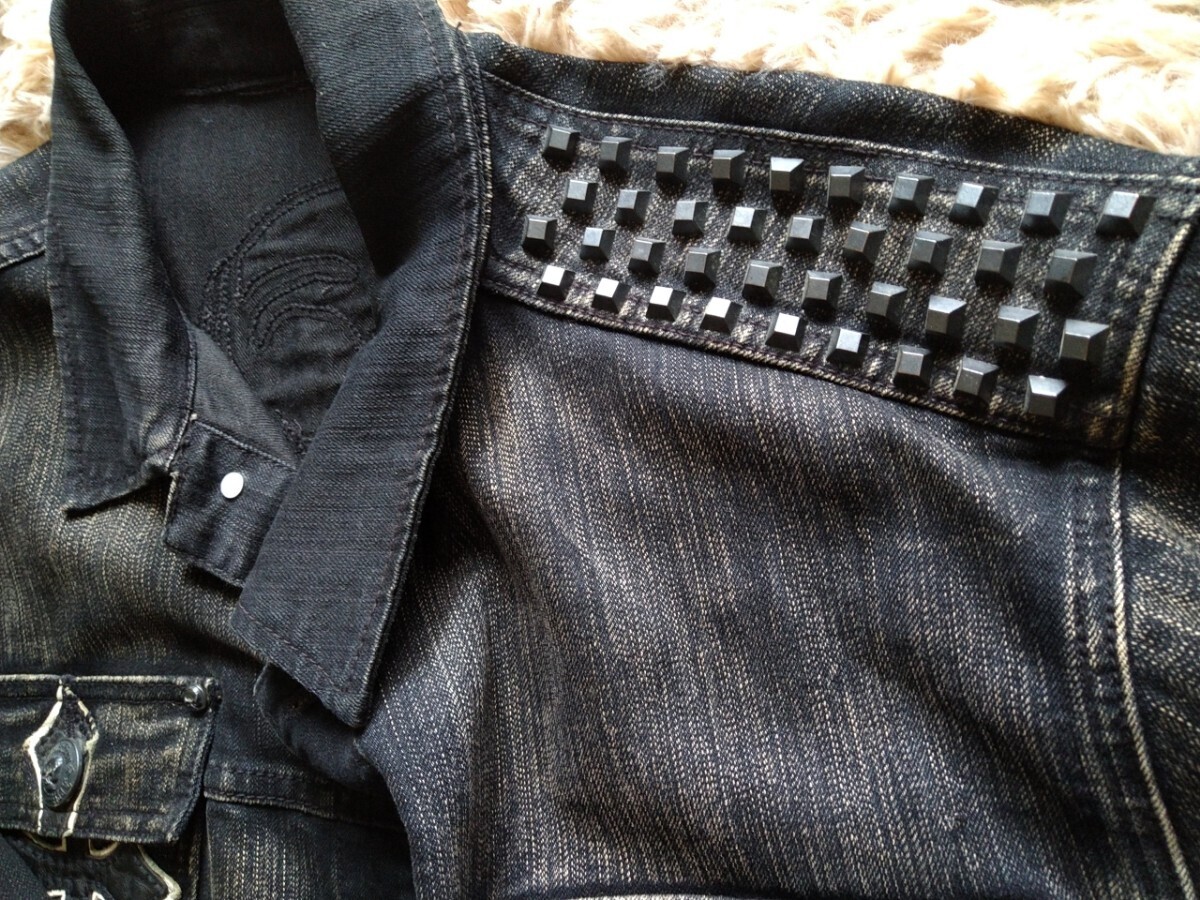 レザーワッペンとスカルボタン、左肩部分のインパクトがかなり強く古着感も相まって
