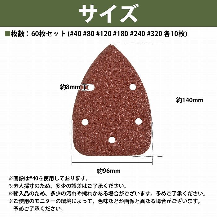 【新品即納】粗目 60枚セット コーナーサンダー 140㎜×90㎜ #40/80/120/180/240/320 6種 各10枚 三角形 サンドペーパー 紙やすり マウス