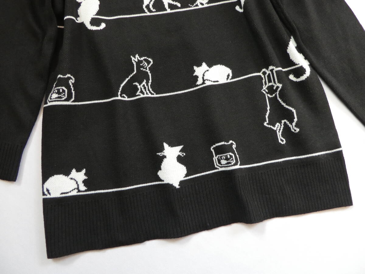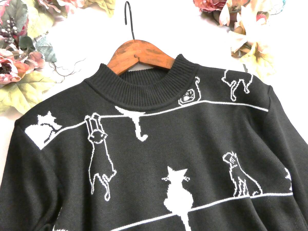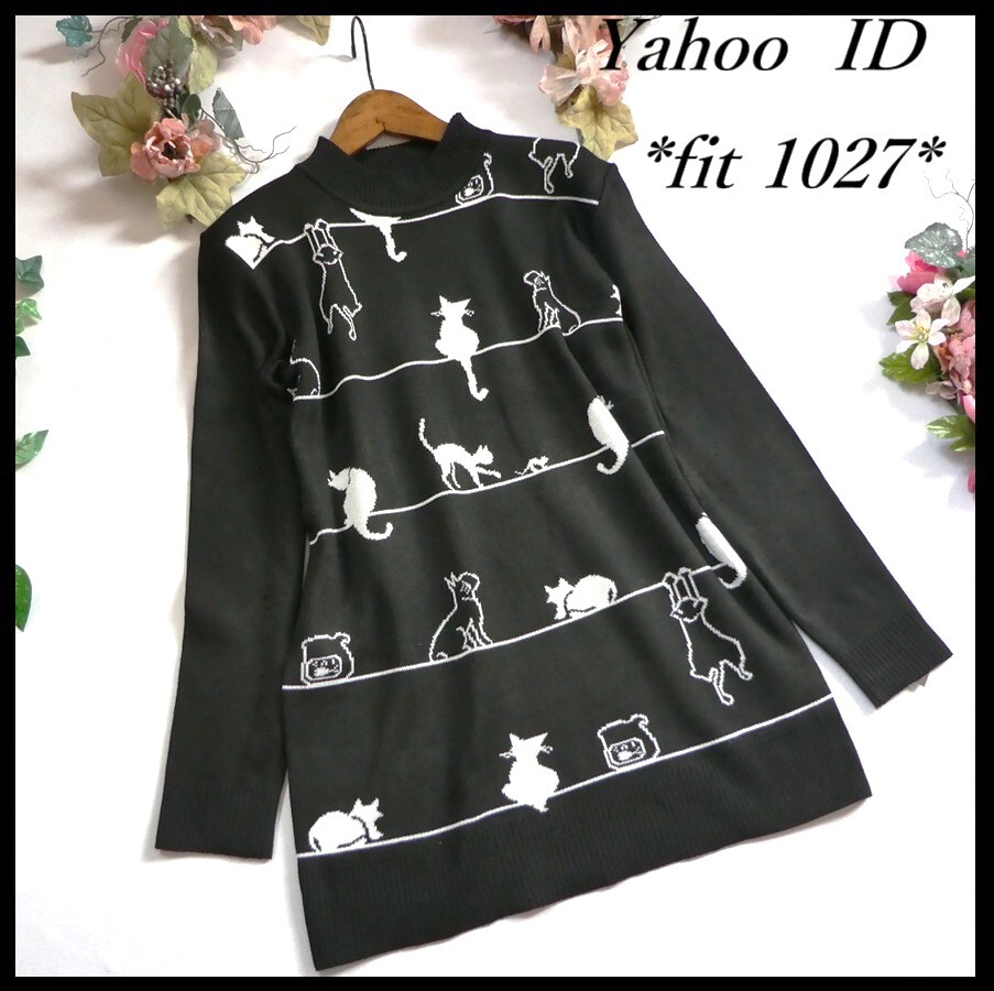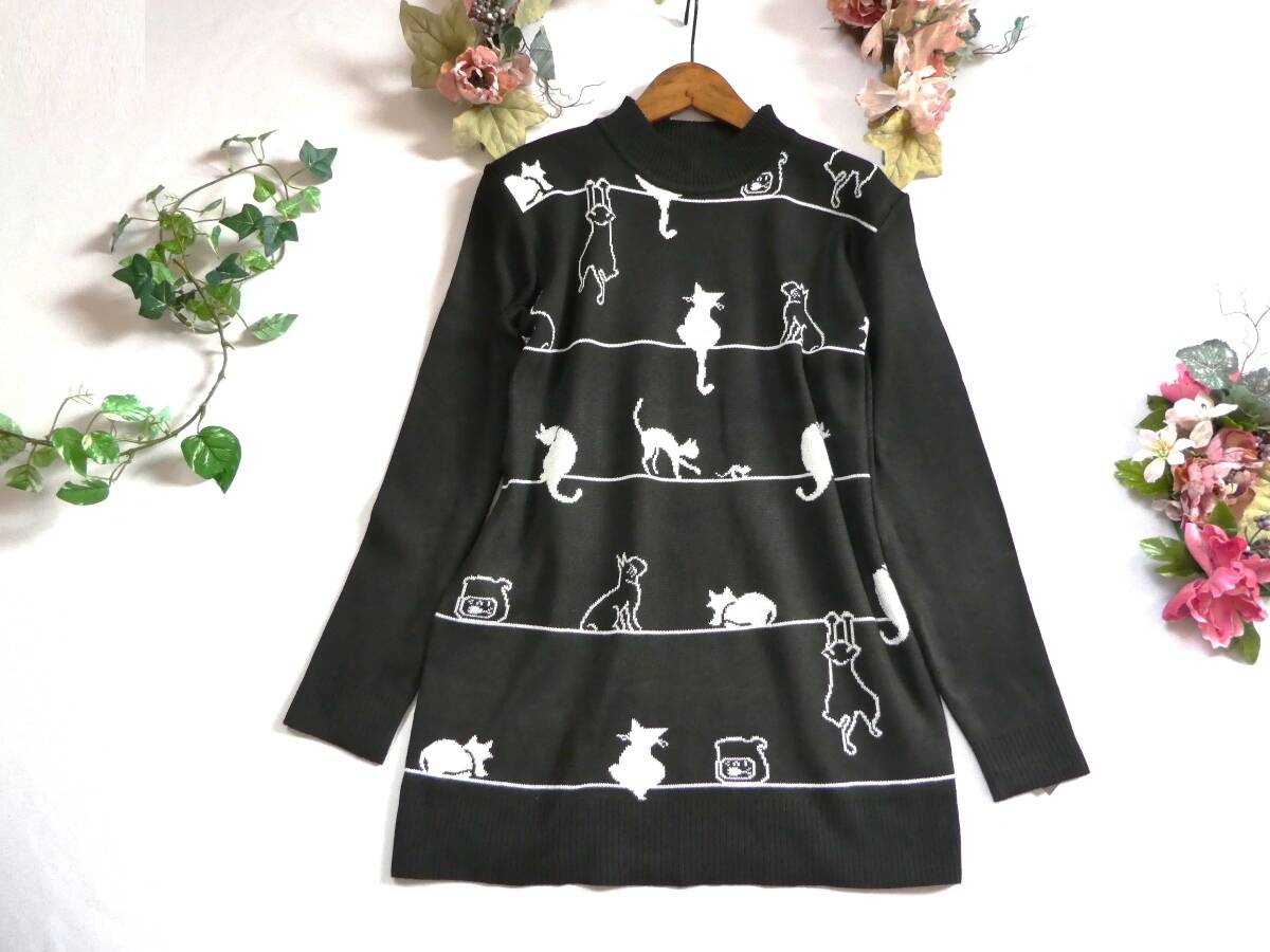 ゆったりサイズ【新品】ミドルゲージニット素材☆可愛いネコちゃんがいっぱい♪ハイネックチュニック★黒×白◆fit1027◆