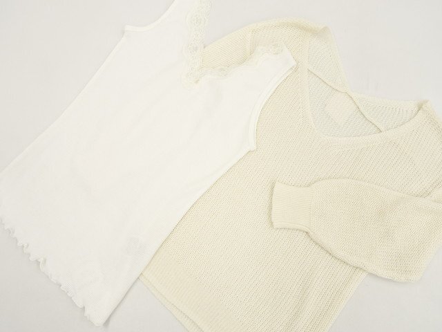 長袖ニットセーター+タンクトップ+ひざ丈タイトスカート コーディネート上下3点セット M相当 オフホワイト/ホワイト/ブラウン系杢 ブラウン×アイボリー×ボルドー ボーダー柄 カジュアル・ナチュラル系 30~40代