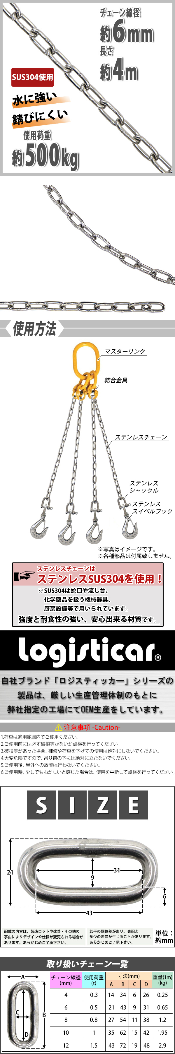 | 商品名 | 送料無料 ステンレスチェーン チェーン 線径約6mm 使用荷重約500kg 約4m SUS304 JIS規格 ステンレス製 鎖 くさり 吊り具 チェーンスリング スリングチェーン リンクチェーン チェイン 金具 クレーン ホイスト 玉掛け 吊り上げ 建築 工場 水まわり suschain6mm4m |