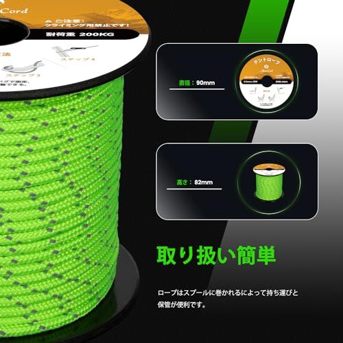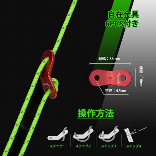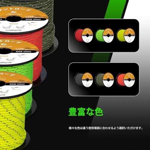 【利用場所】テント、天幕、キャンプなどのアウトドアレジャー以外でも何かと使えるロープです。ご注意:ロッククライミング&プロ登山用ロープとして使用できない。緊急にパラコードで体重を支える場合は、折り返して何本を束ねて利用してください。