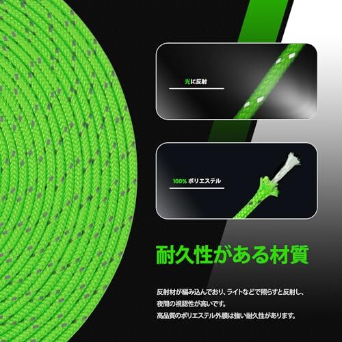 3mmx30M-反射ネオングリーン Abma Cord ガイロープ テントロープ 3mm/4mm 反射パラコード 自在金具付き 3