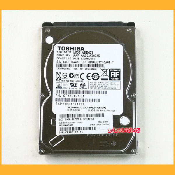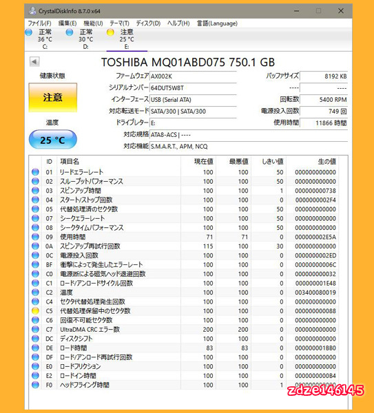 2.5インチ 750GB 型番:MQ01ABD075 【1】 CrystalDiskInfo・HD Tuneでチェック済です 異音等はありませんでしたがCrystalDiskInfoで注意表示があります |