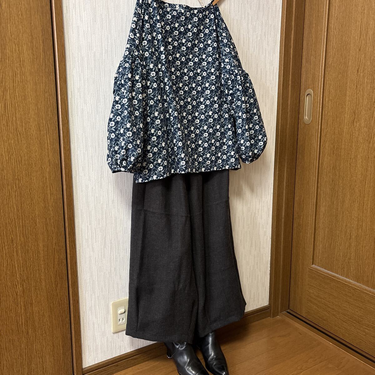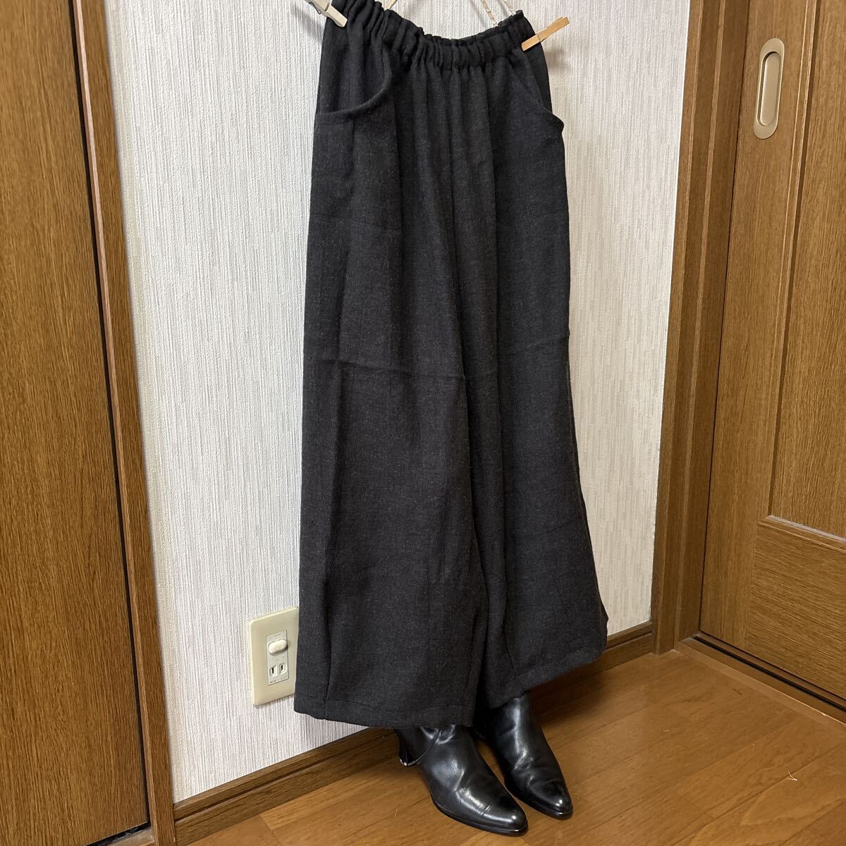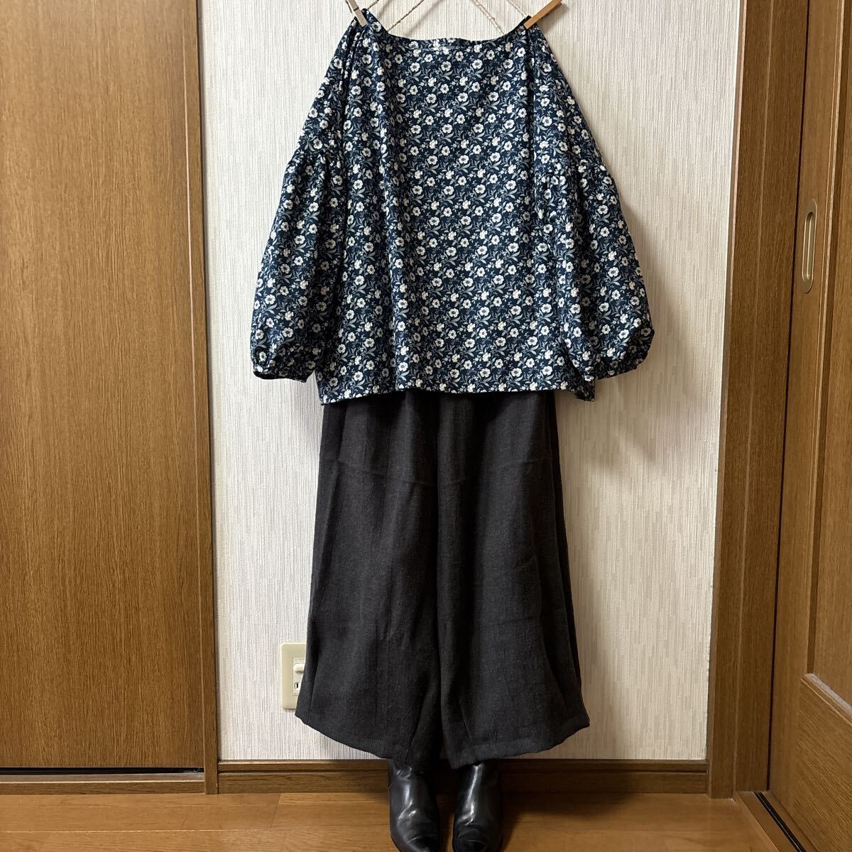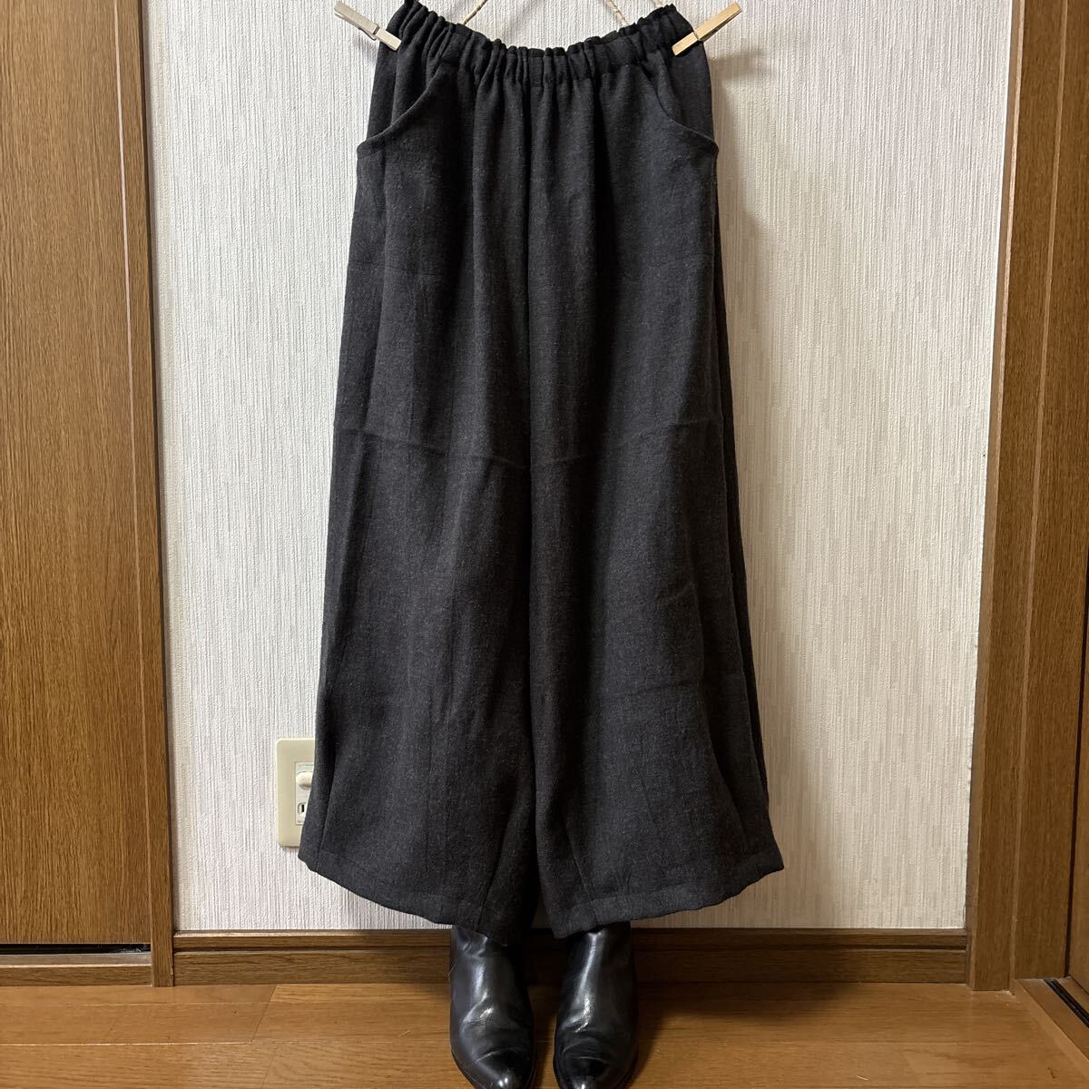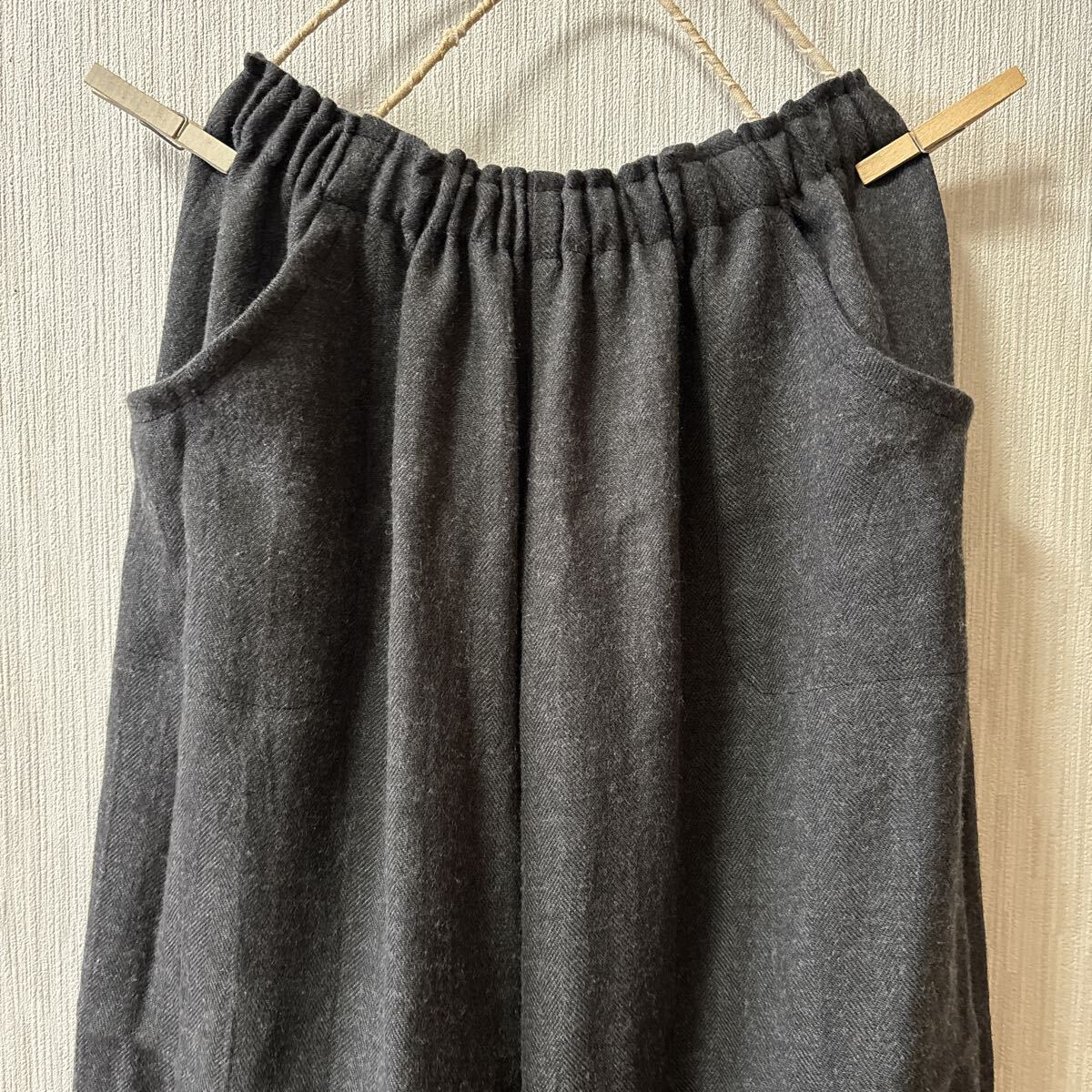チャコールグレー色のヘリンボーンのコットンリネン生地で、裾バルーンのワイドパンツをつくりました。