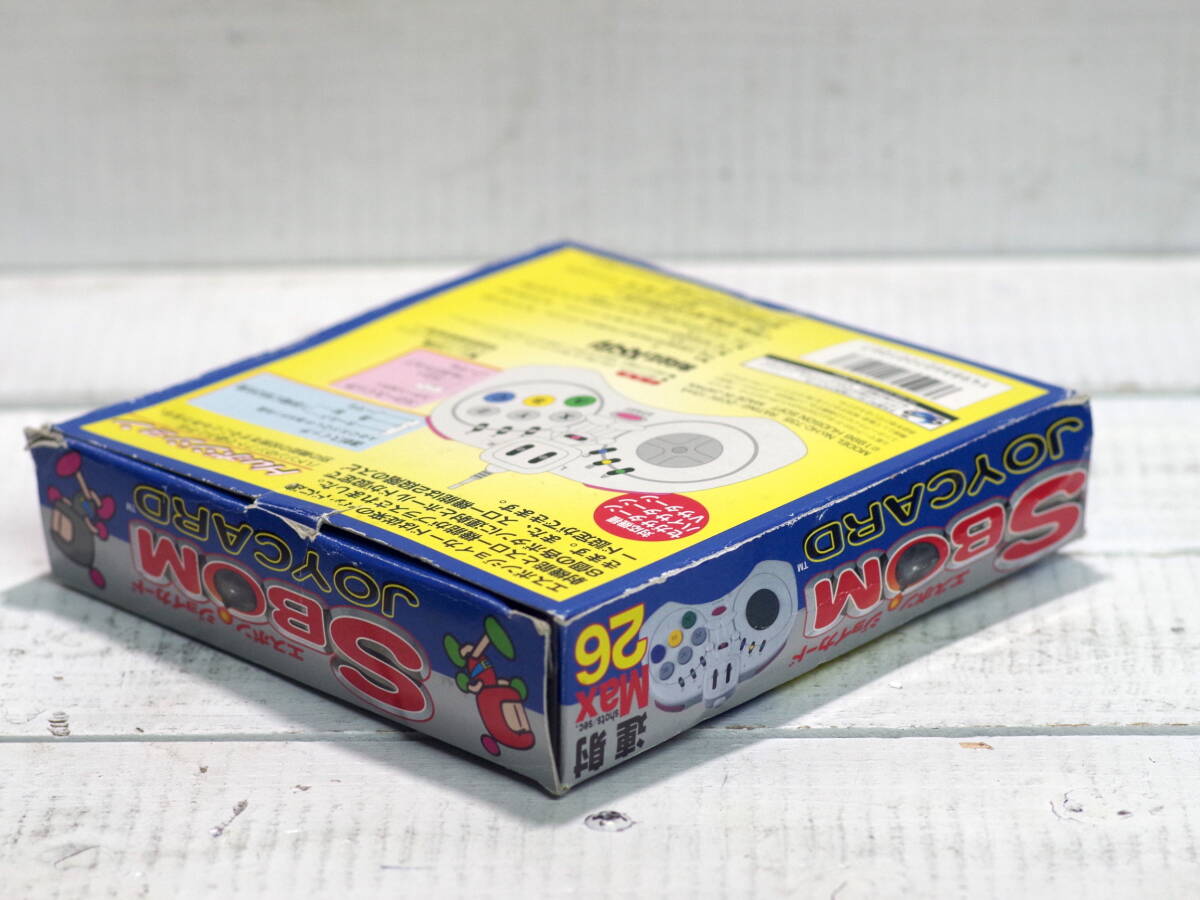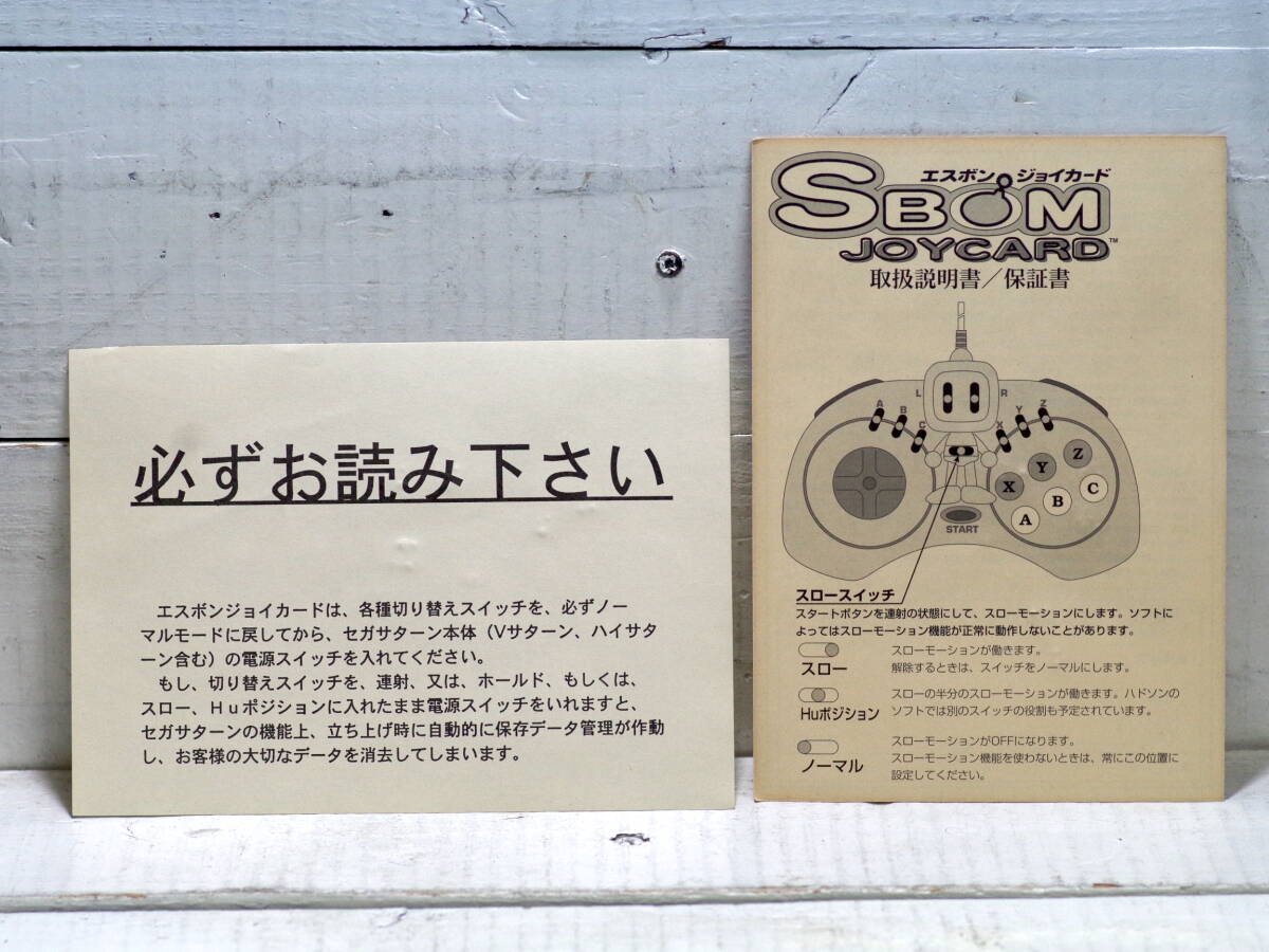 こちらはセガサターン箱/説明書付 SBOM JOYCARD エスボンジョイカード です。ハドソン社のもので連射MAX26機能付きです。箱にダメージありますが本体は未使用です。現状です。すべての機能はチェックしておりません。古いゲーム機は発送時のショックで不具合を起こすことが稀にあります。万が一メンテナンスの必要が発生した場合は、お客様自身でお願い致します。