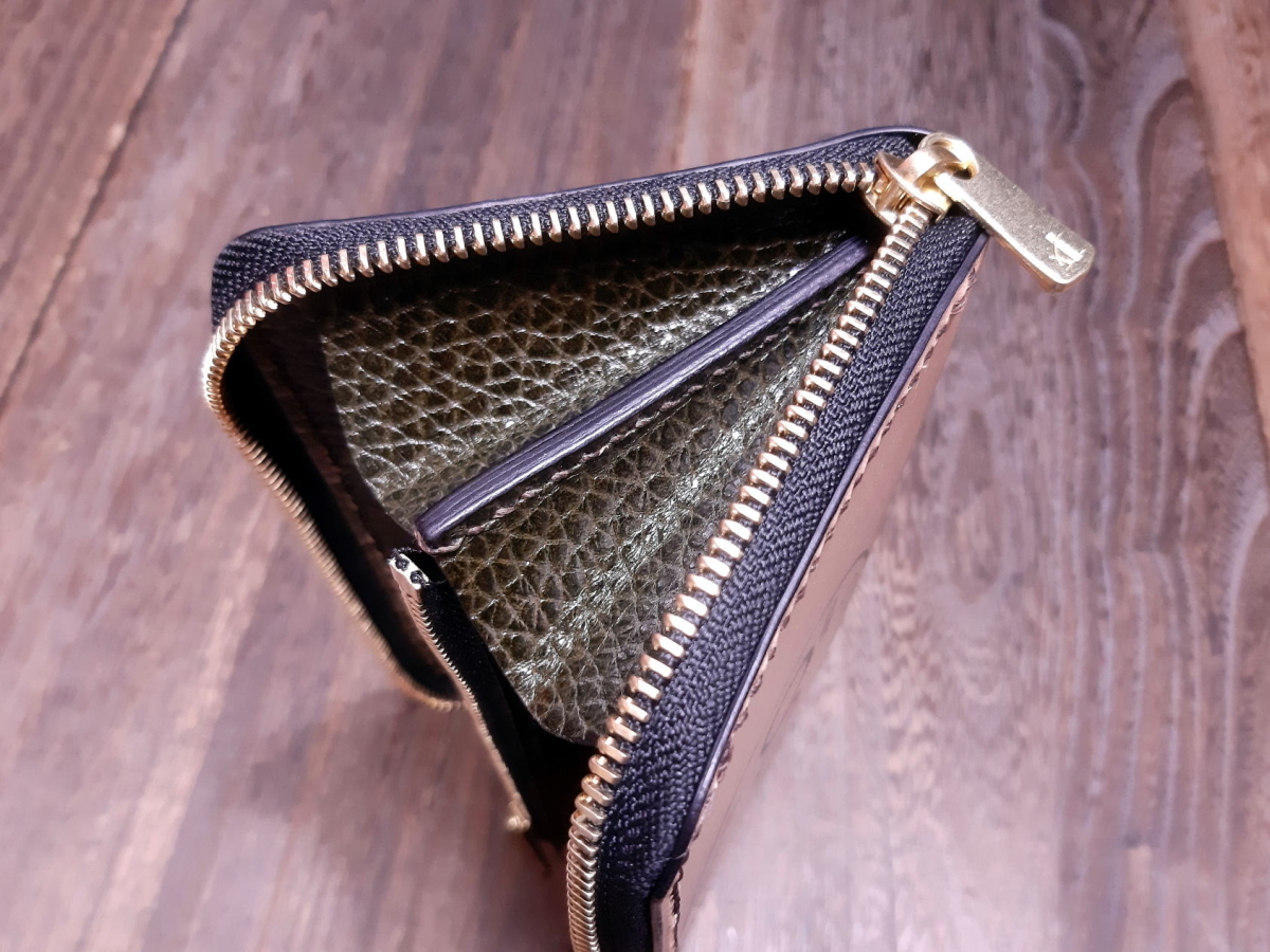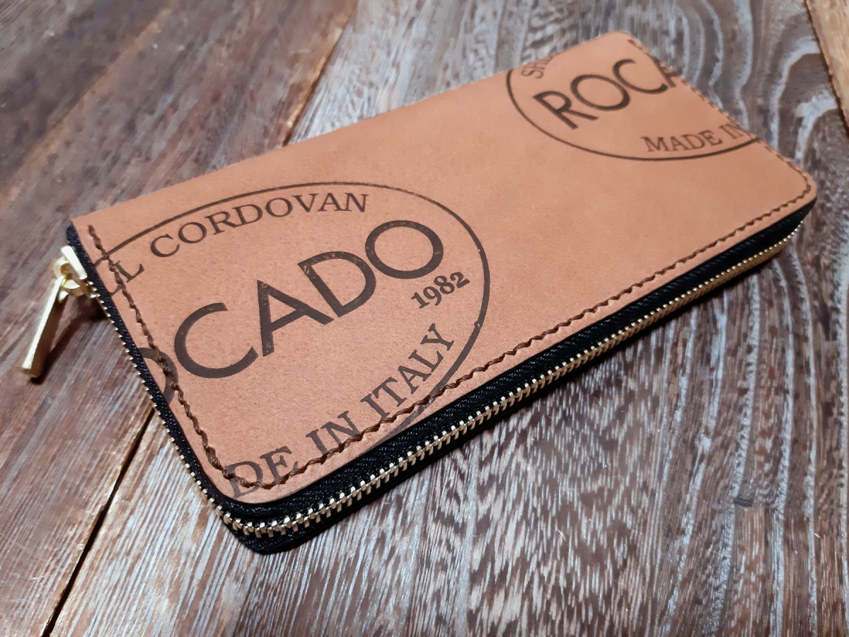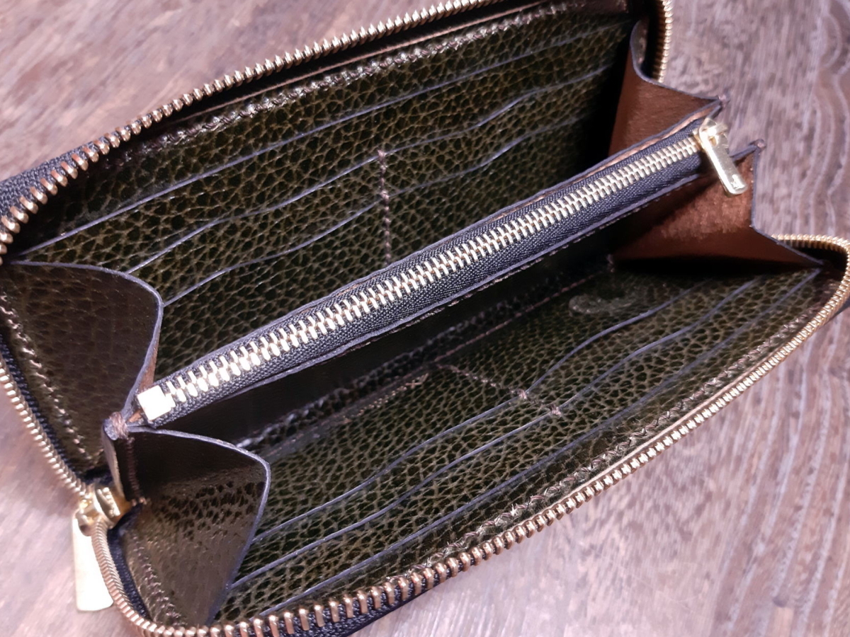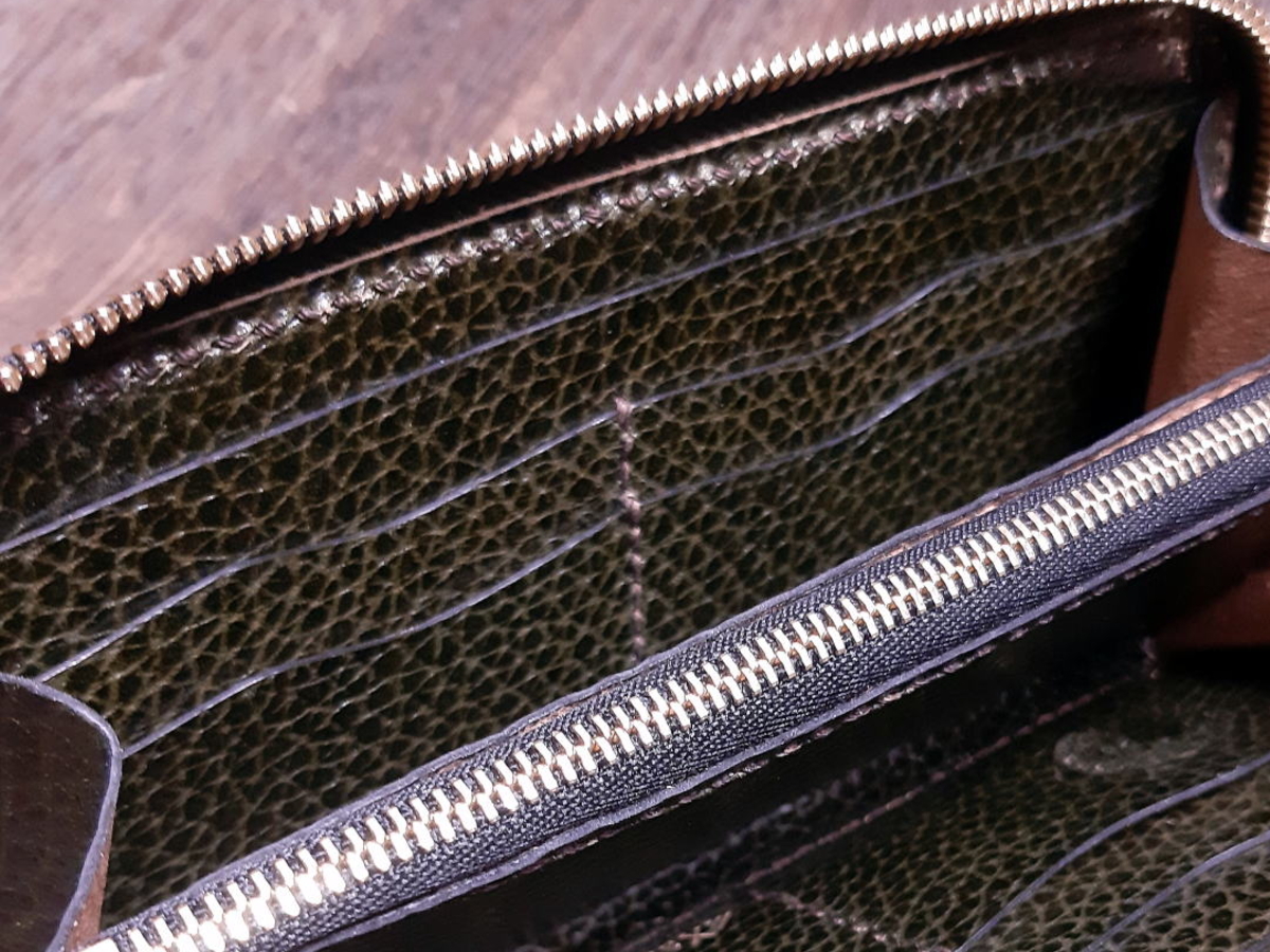 外装に「ロカド社製シェルコードバン」のスタンプ部分を使用し、内装にはIL PONTE(イルポンテ)社製のドラーロを使用した総手縫いのラウンドファスナー長財布です。